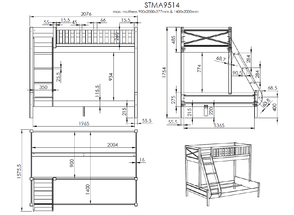 Dit is een stapelbed waarvan beide lattenbodems zijn meegeleverd worden. Het bovenste bed 90x200cm groot is en het onderste bed 140x200cm. Het bed is heel stevig en het bed kan gespiegeld worden zodat het in elke kamer past.