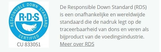- Ook kun je gerust slapen, want er wordt enkel dons gebruikt dat gecertificeerd is volgens de Responsible Down Standard (R.D.S.).