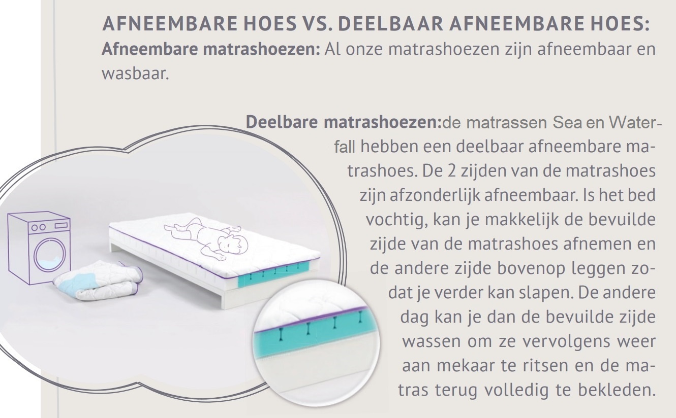 4. Deelbare matrashoes: De 2 zijden van de matrashoes zijn afzonderlijk afneembaar en wasbaar. Is er een ongelukje gebeurd? Geen probleem, je kunt 1 kant van de matrashoes afnemen en wassen en de andere kant bovenop leggen zodat je baby verder kan slapen (matras met deze eigenschap: Sea en Waterfall)