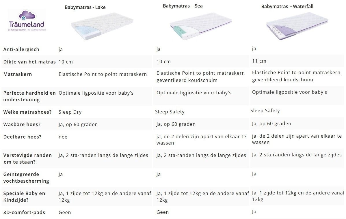 Kinderkamerwebwinkel verkoopt de 3 meest populaire babymatrassen van Träumeland in de maten 60x120cm en 70x140cm. Wij hebben deze matrassen het gehele jaar door op voorraad en kunnen het binnen enkele dagen gratis bij je thuis bezorgen.