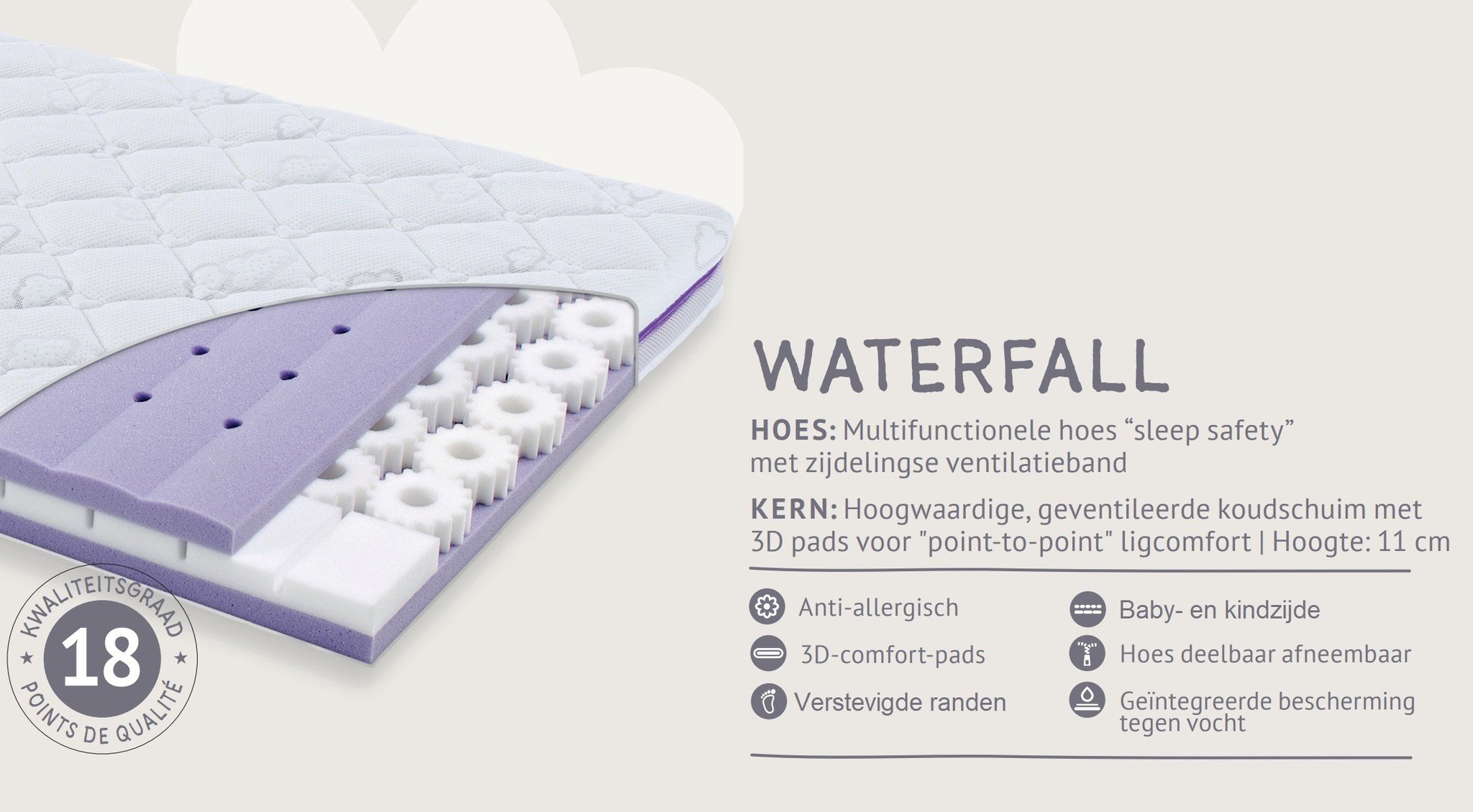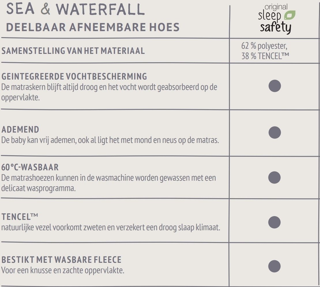 4. Deelbare matrashoes: De 2 zijden van de matrashoes zijn afzonderlijk afneembaar en wasbaar. Is er een ongelukje gebeurd? Geen probleem, je kunt 1 kant van de matrashoes afnemen en wassen en de andere kant bovenop leggen zodat je baby verder kan slapen (matras met deze eigenschap: Sea en Waterfall)
