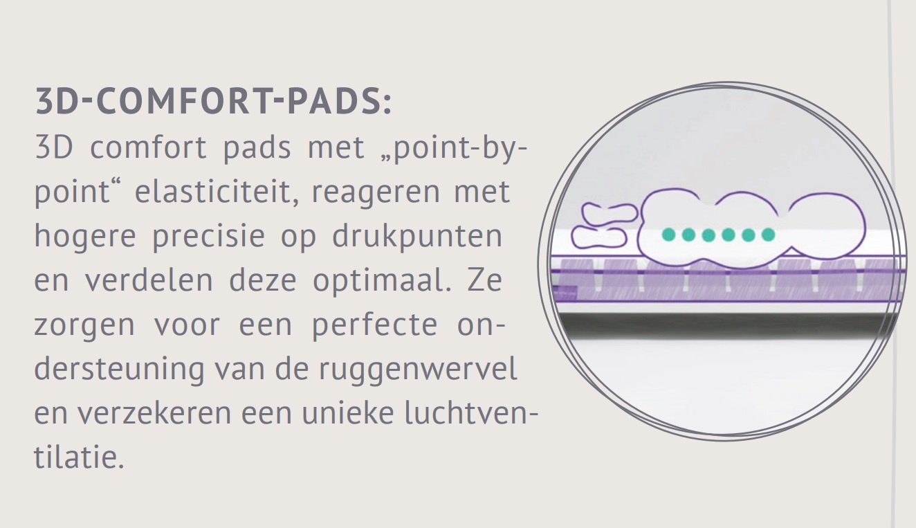 5. 3d-comfort-pads. Deze luxe pads reageren met hoge precisie op drukpunten en verdelen deze optimaal (matras met deze eigenschap: Waterfall)