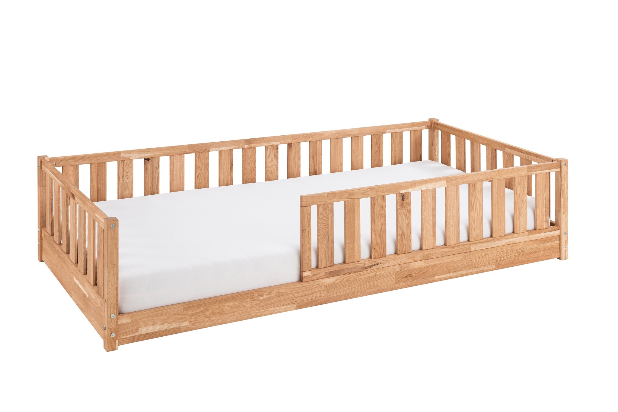 Dit vloerbed is gemaakt van massief eiken en inclusief een stevige lattenbodem, biedt comfort en ondersteuning. De uitvalbescherming en instap kunnen zowel links als rechts worden gemonteerd, waardoor het bed flexibel aanpasbaar is aan elke kinderkamer.