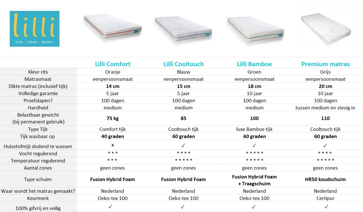 Bij de productfoto's zie je een handig overzicht van de kenmerken van de verschillende matrassen. Je kunt natuurlijk ook even naar de productpagina van het matras gaan voor uitgebreide informatie.