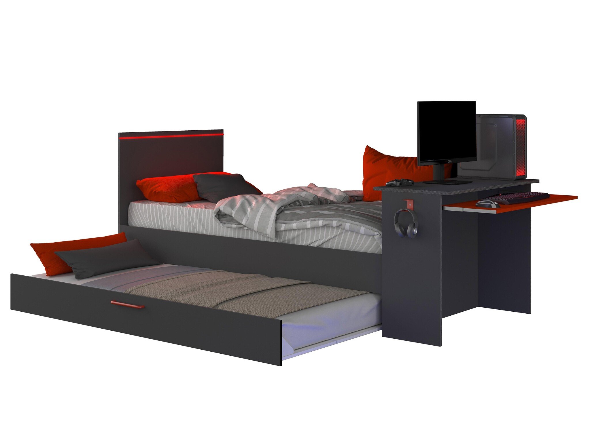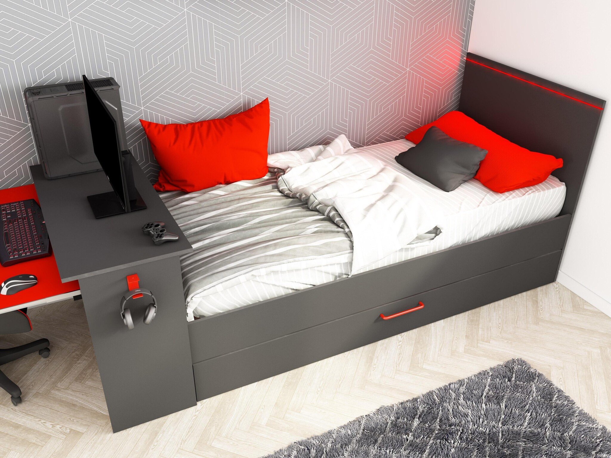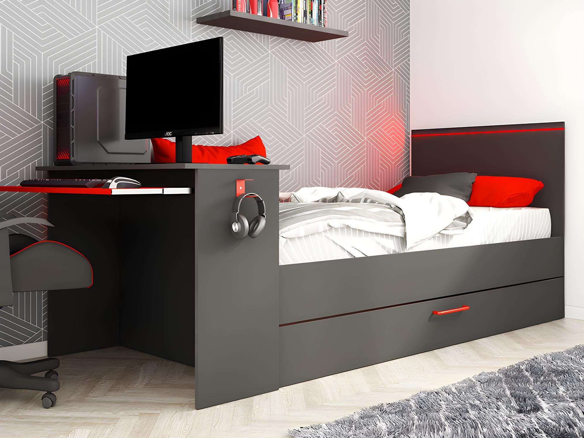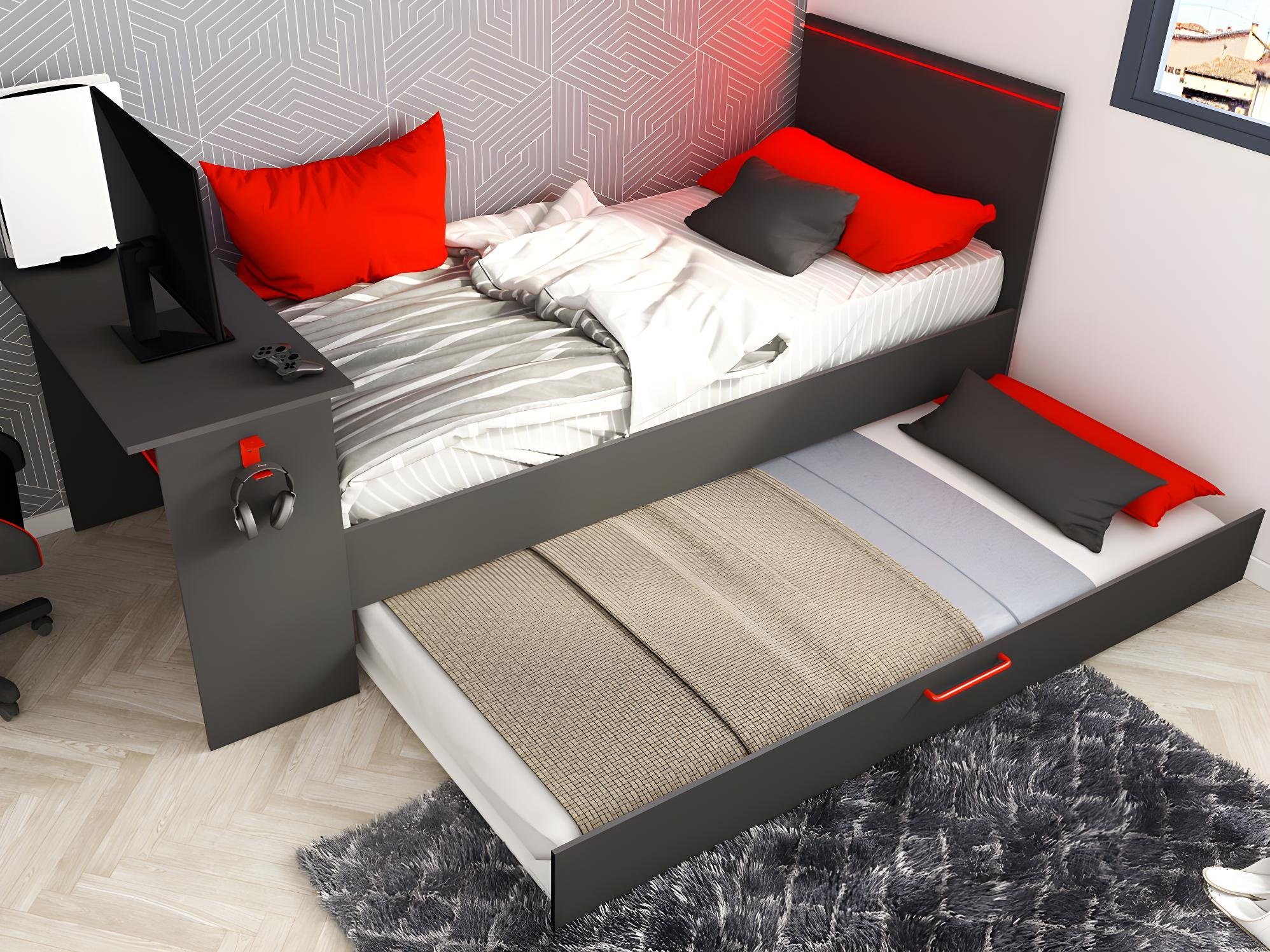 Met dit bed transformeer je je kamer in een echte mancave/gaming kamer. Dit bed wordt compleet geleverd met: