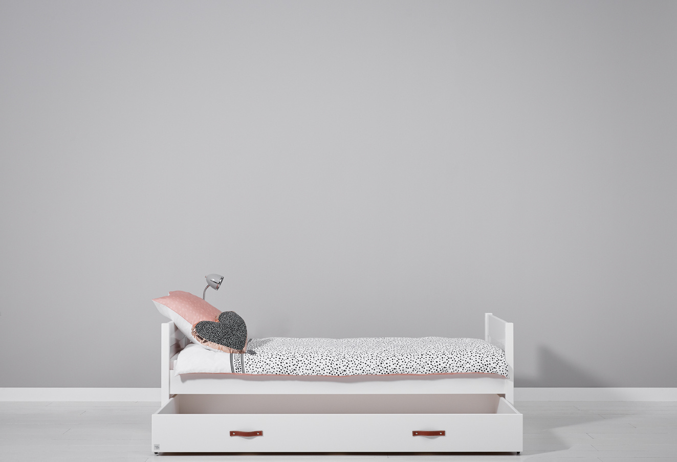✔ Uit te breiden met een slaaplade met leren grepen die je ook kunt gebruiken om spullen in op te bergen (matrasmaat 90x190)