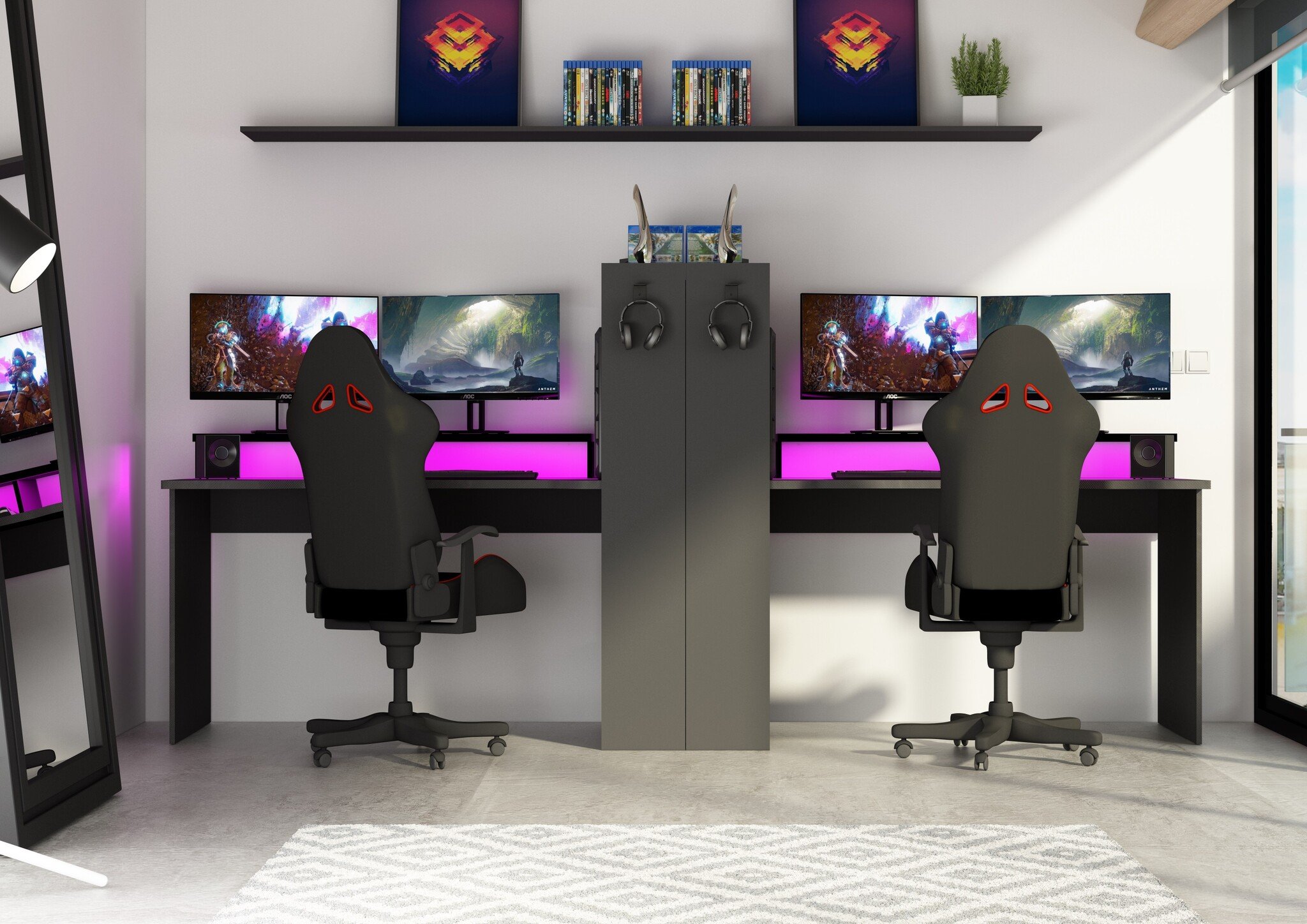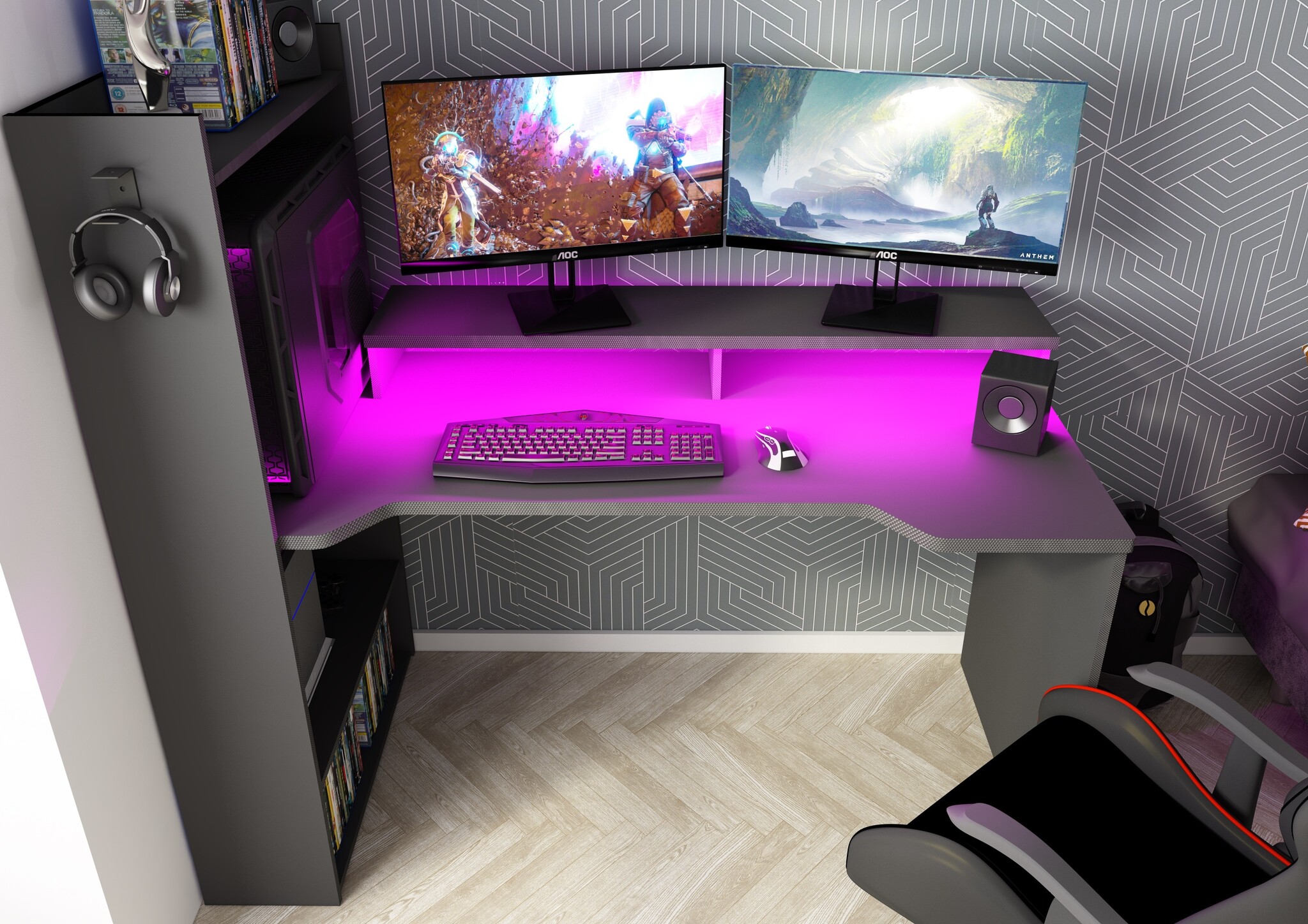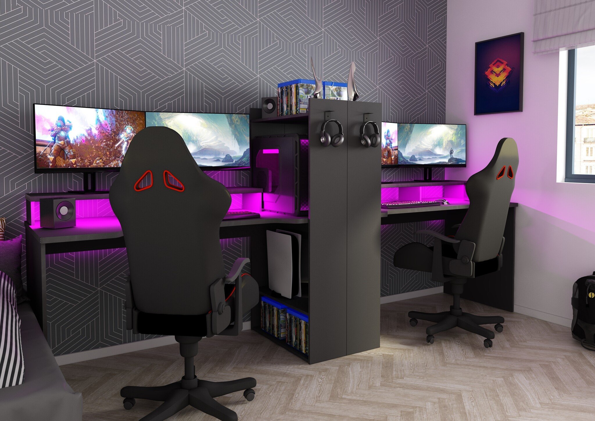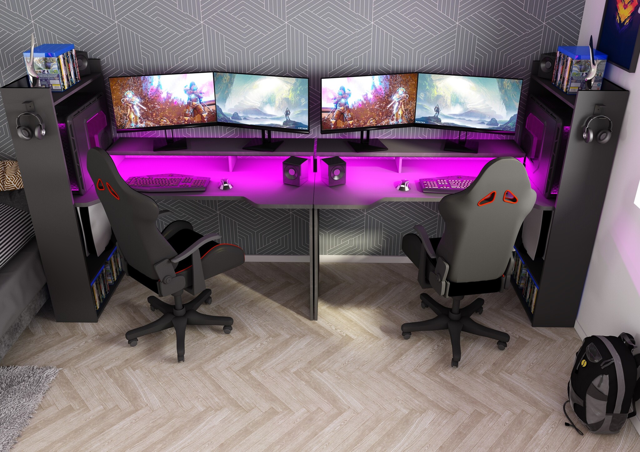 In de ruimte eronder zit ledverlichting in twintig kleuren, waarmee je de game-ervaring helemaal compleet maakt. En wat dacht je ervan om 2 van deze bureaus naast elkaar te zetten? Zo creëer je een fantastische game kamer.