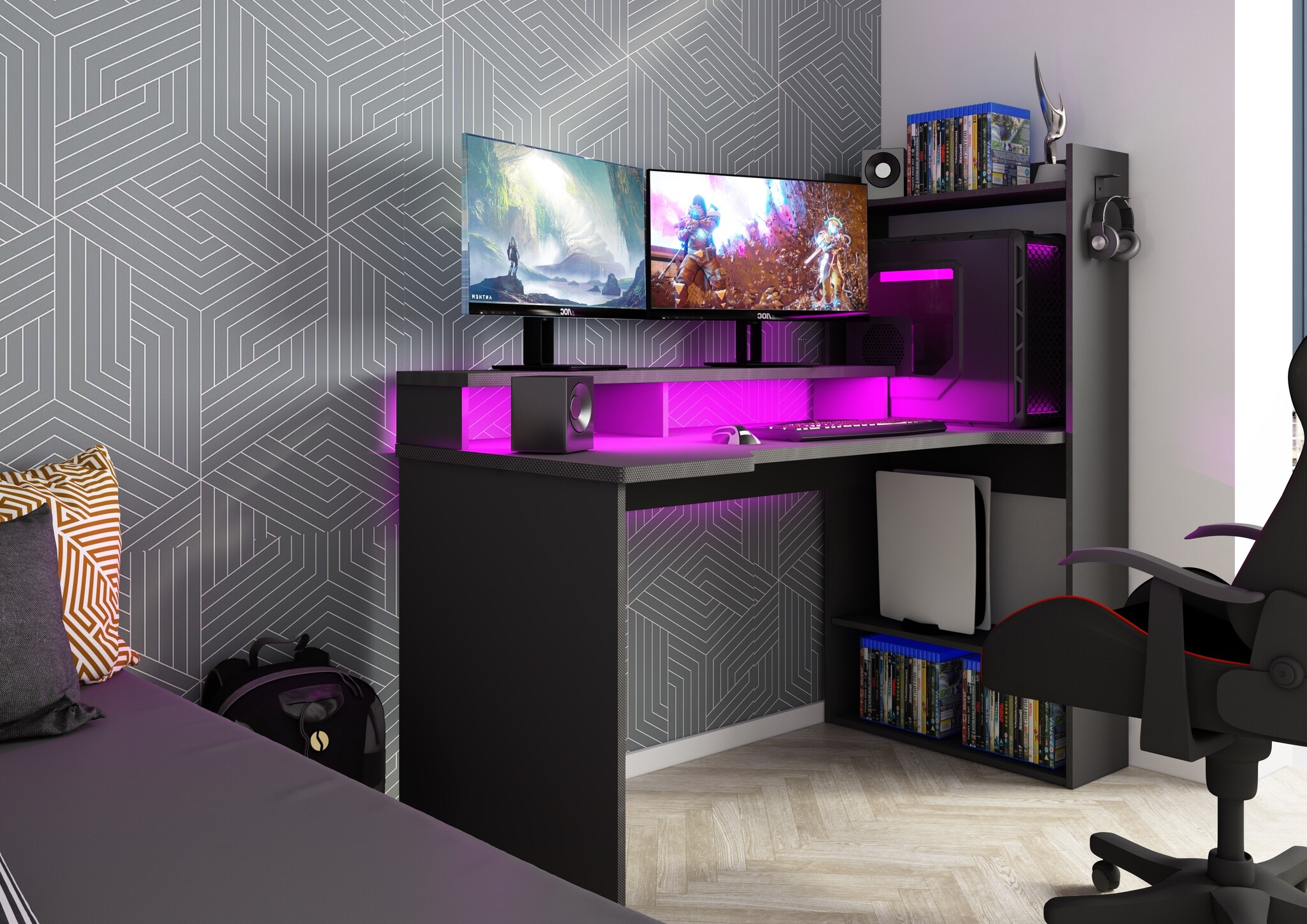 Je kunt gemakkelijk huiswerk maken aan dit bureau, je spullen goed opbergen en zelfs lekker en comfortabel gamen.