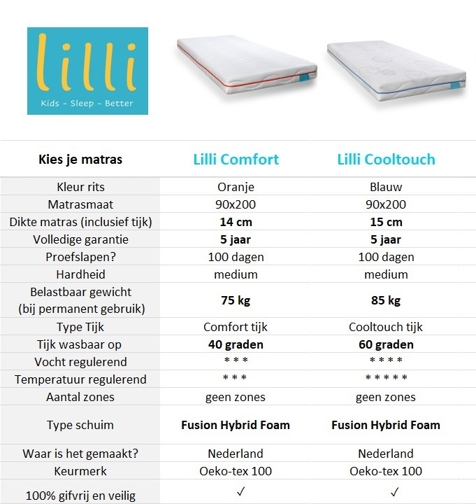 Bij de productfoto's zie je een handig overzicht van de kenmerken van de verschillende matrassen. Je kunt natuurlijk ook even naar de productpagina van het matras gaan voor uitgebreide informatie.