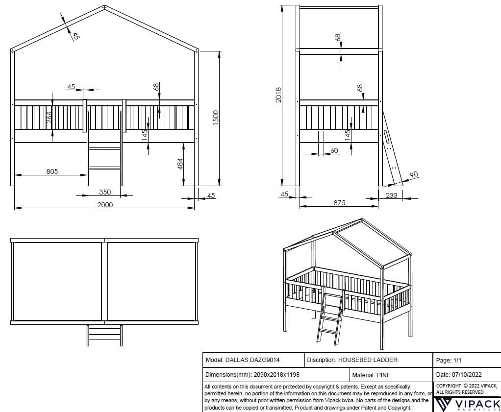 Halfhoogslaper Dallas - 90x200 met dak, zijwanden en glijbaan (variant 4)