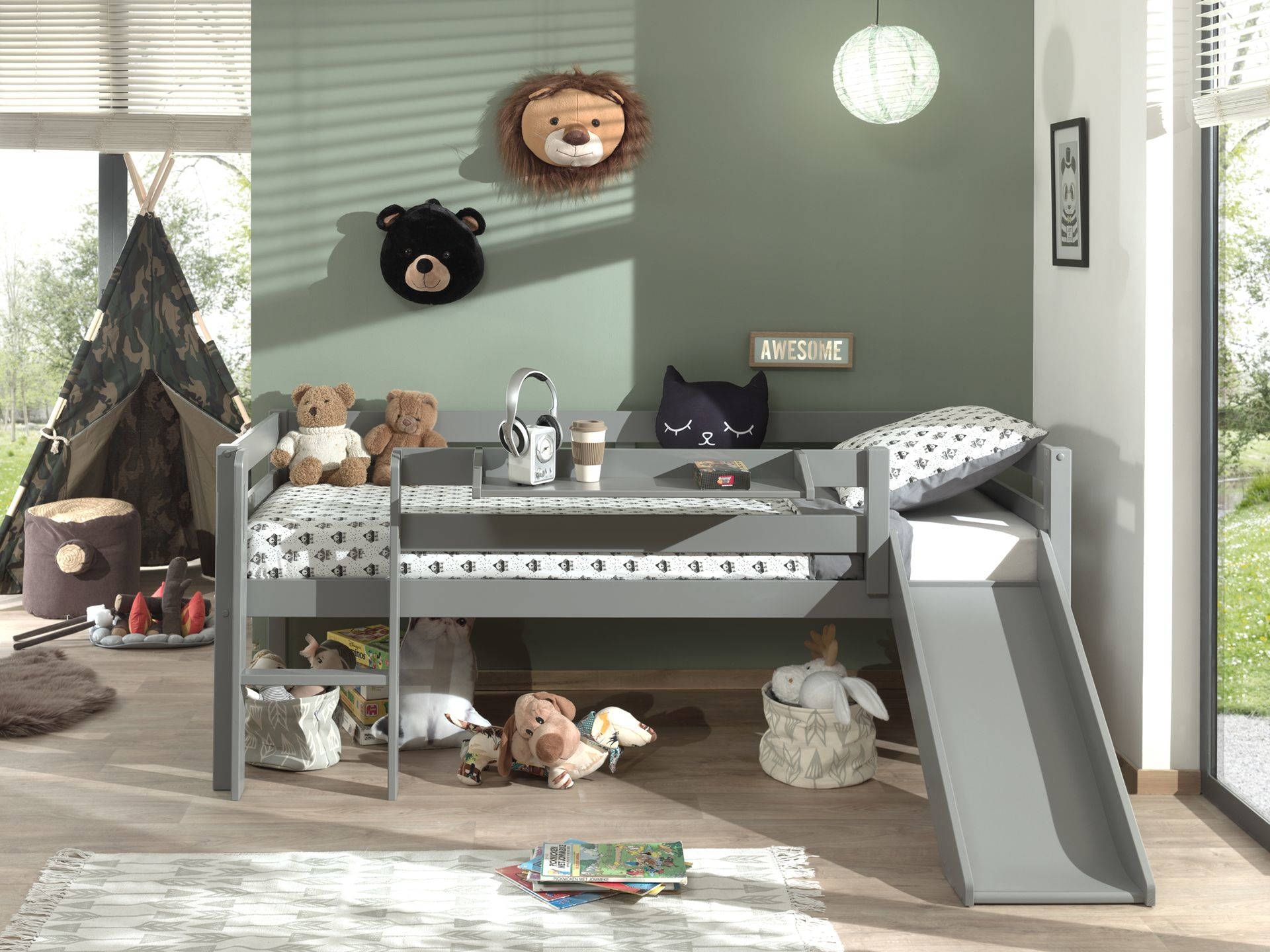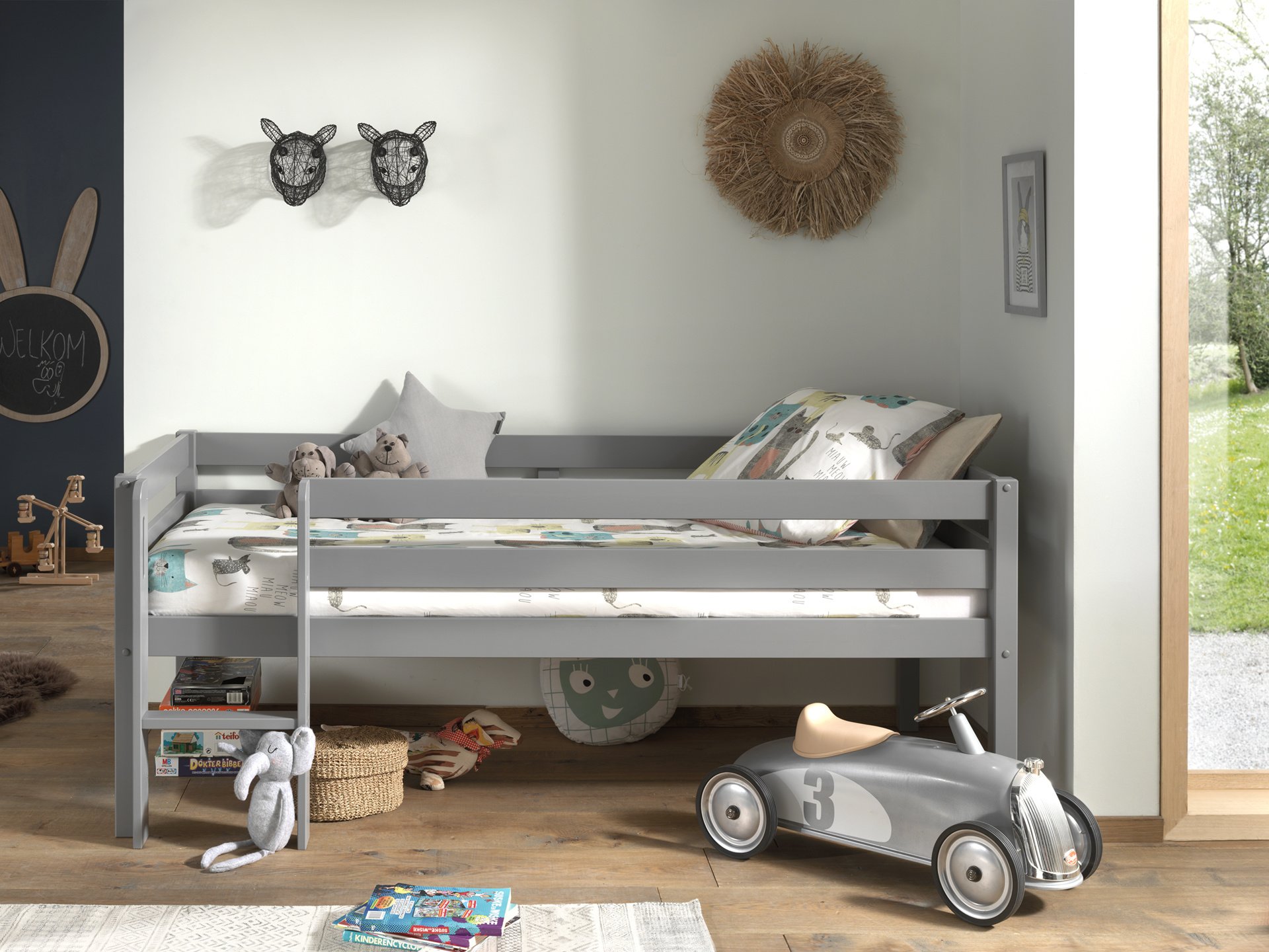 Deze PINO halfhoogslaper is gemaakt van massief grenen en grijs gelakt met kindvriendelijke verf.