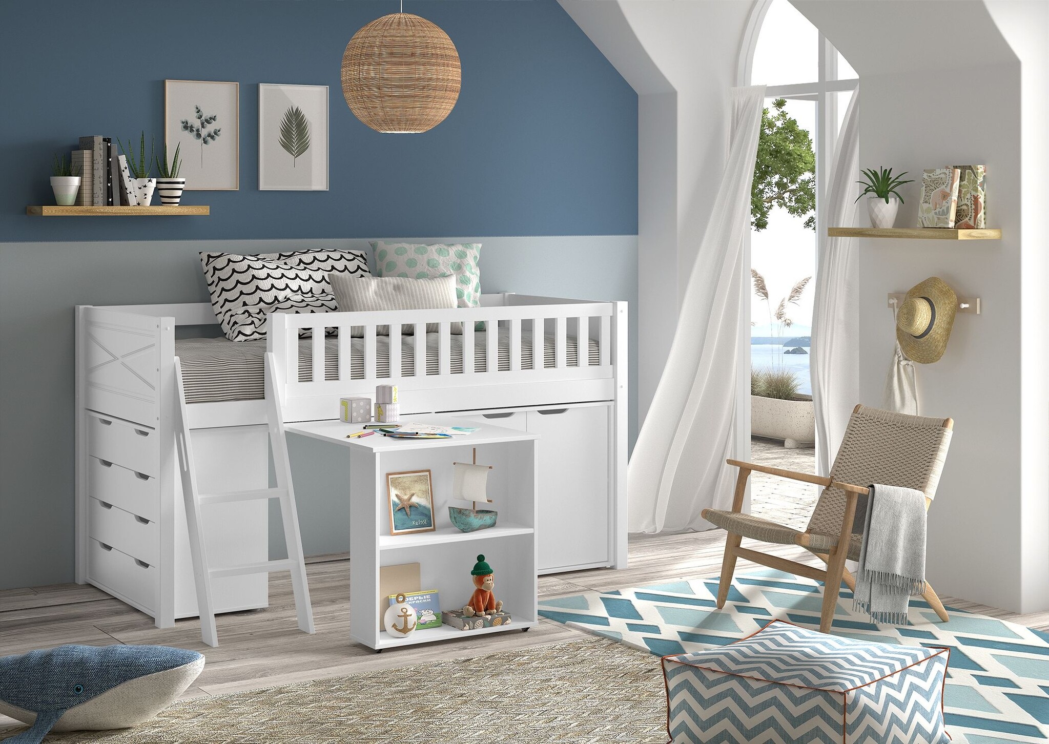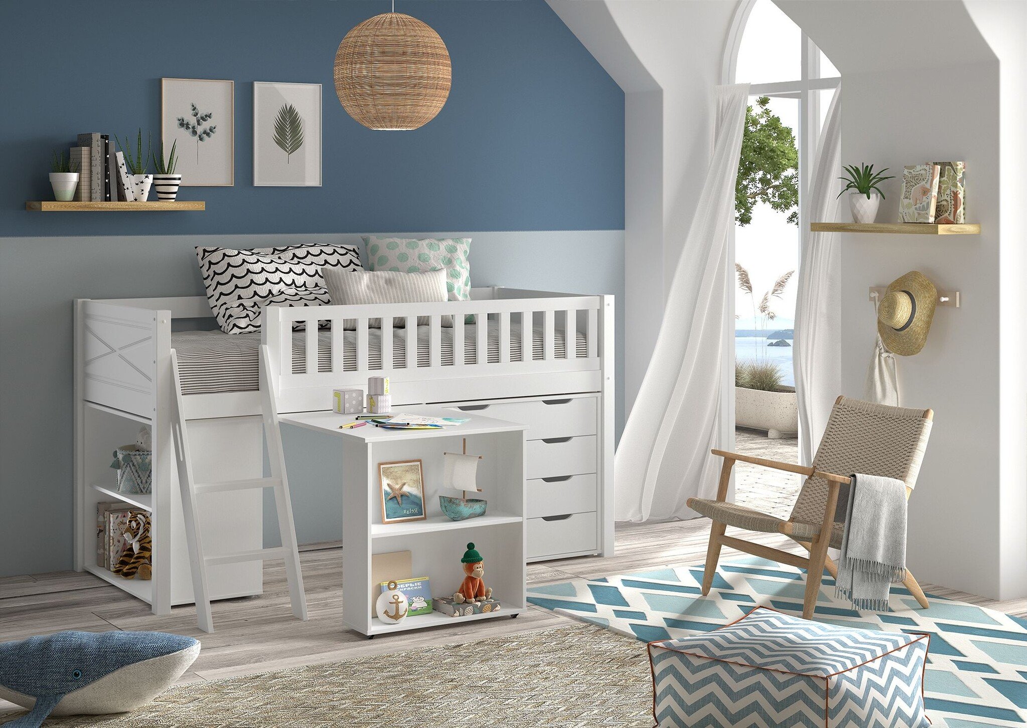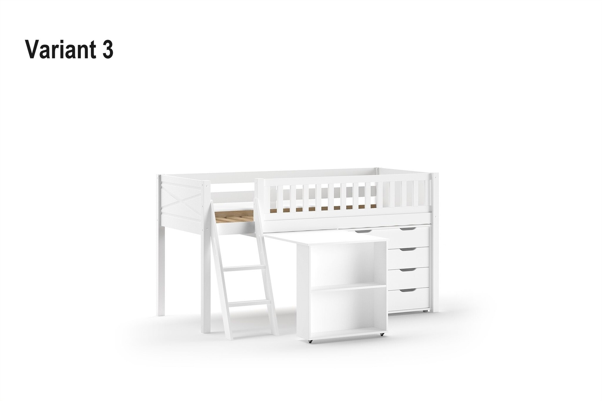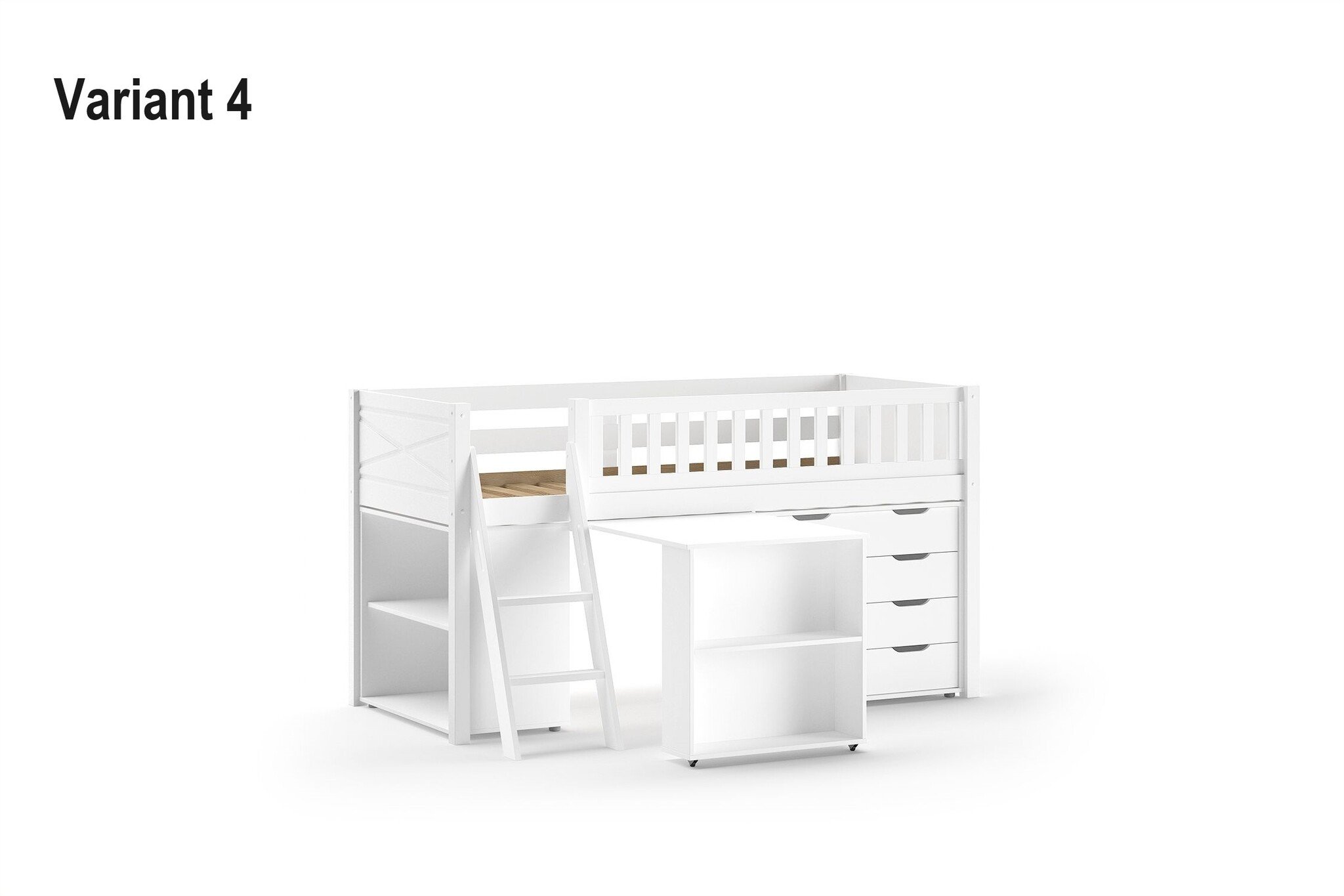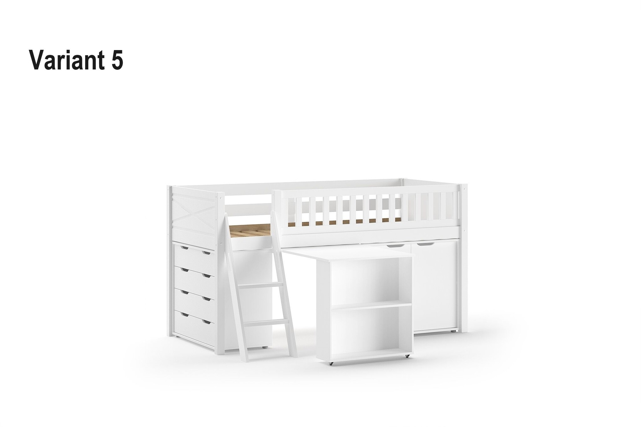 Van dit bed zijn 5 varianten beschikbaar. Deze variant is de variant met het bureau, boekenkast en ladekast.