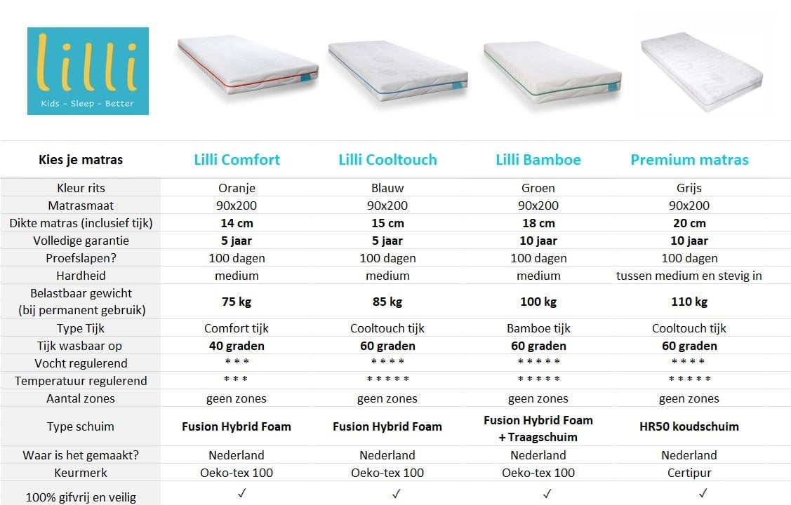 Bij de productfoto's zie je een handig overzicht van de kenmerken van de verschillende matrassen. Je kunt natuurlijk ook even naar de productpagina van het matras gaan voor uitgebreide informatie.