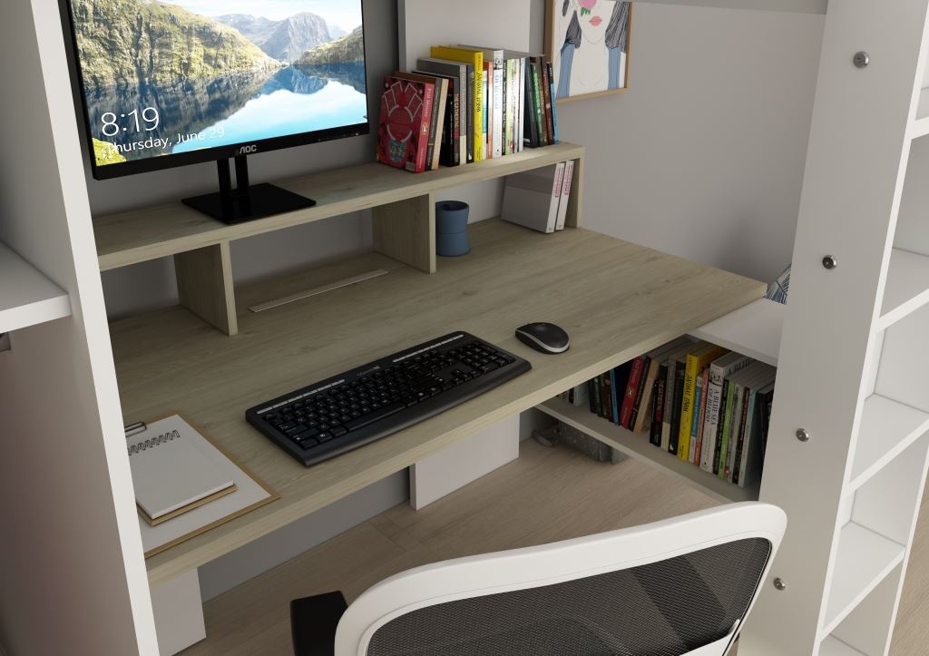 Aan de voorzijde zit een robuuste en veilige trap, met daarachter een bureaublad met handige vakken.