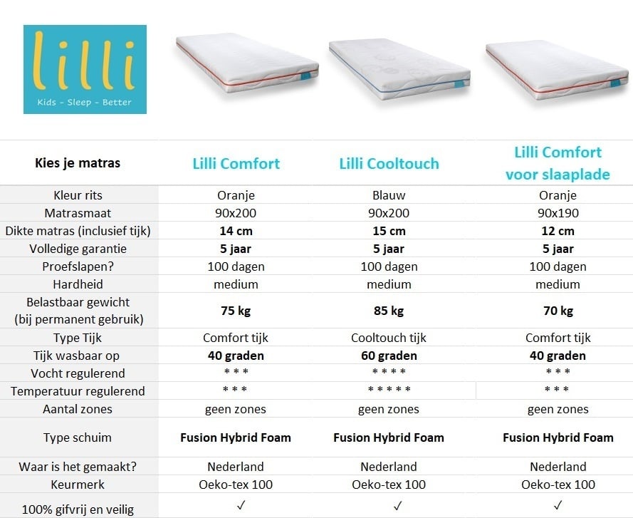 Bij de productfoto's zie je een handig overzicht van de kenmerken van de verschillende matrassen. Je kunt natuurlijk ook even naar de productpagina van het matras gaan voor uitgebreide informatie.