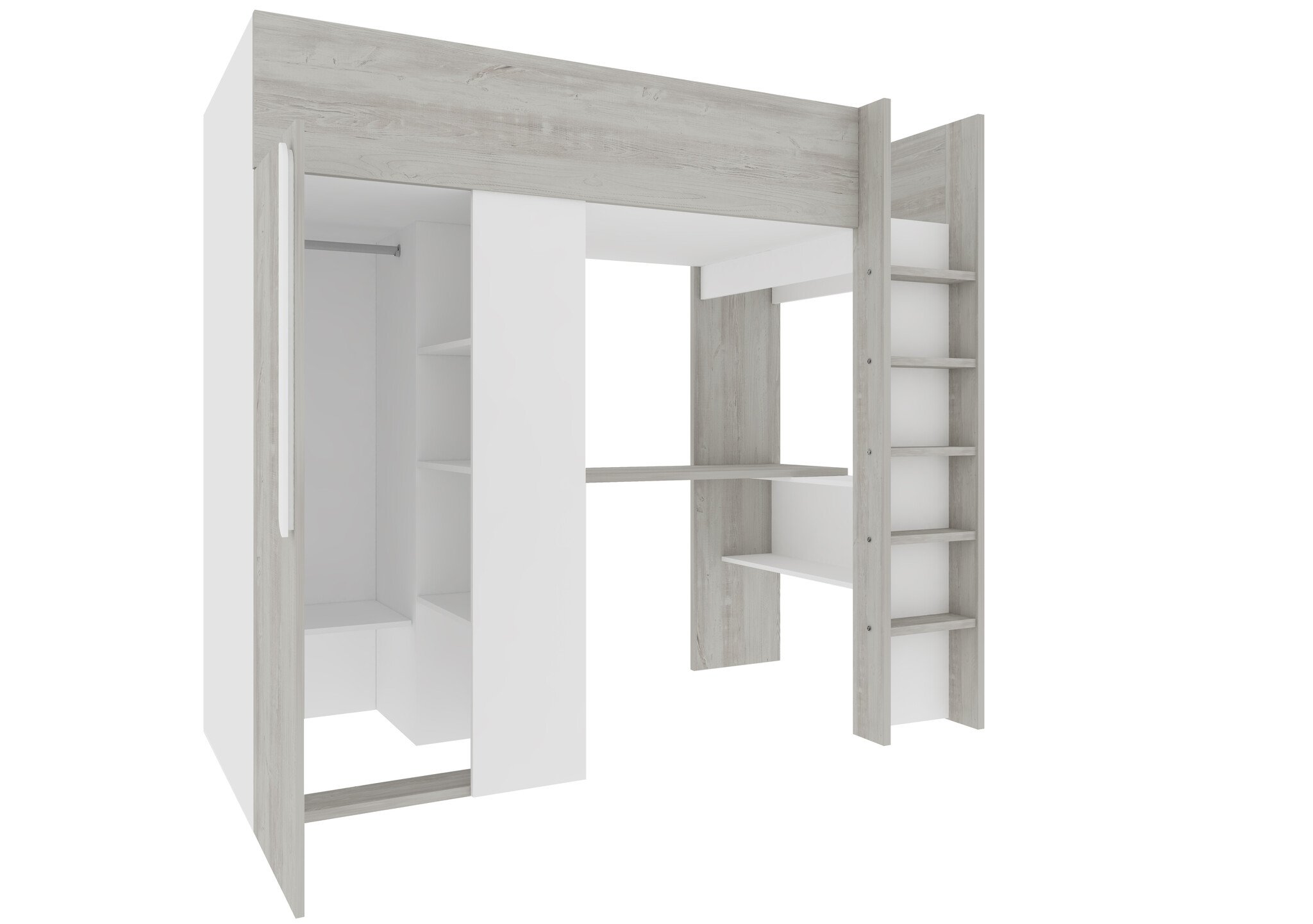 Daar naast bevindt zich een royale kledingkast met een hanggedeelte én een leggedeelte, met drie schappen. Oftewel: de Studio hoogslaper heeft alles wat je kleine nodig heeft.