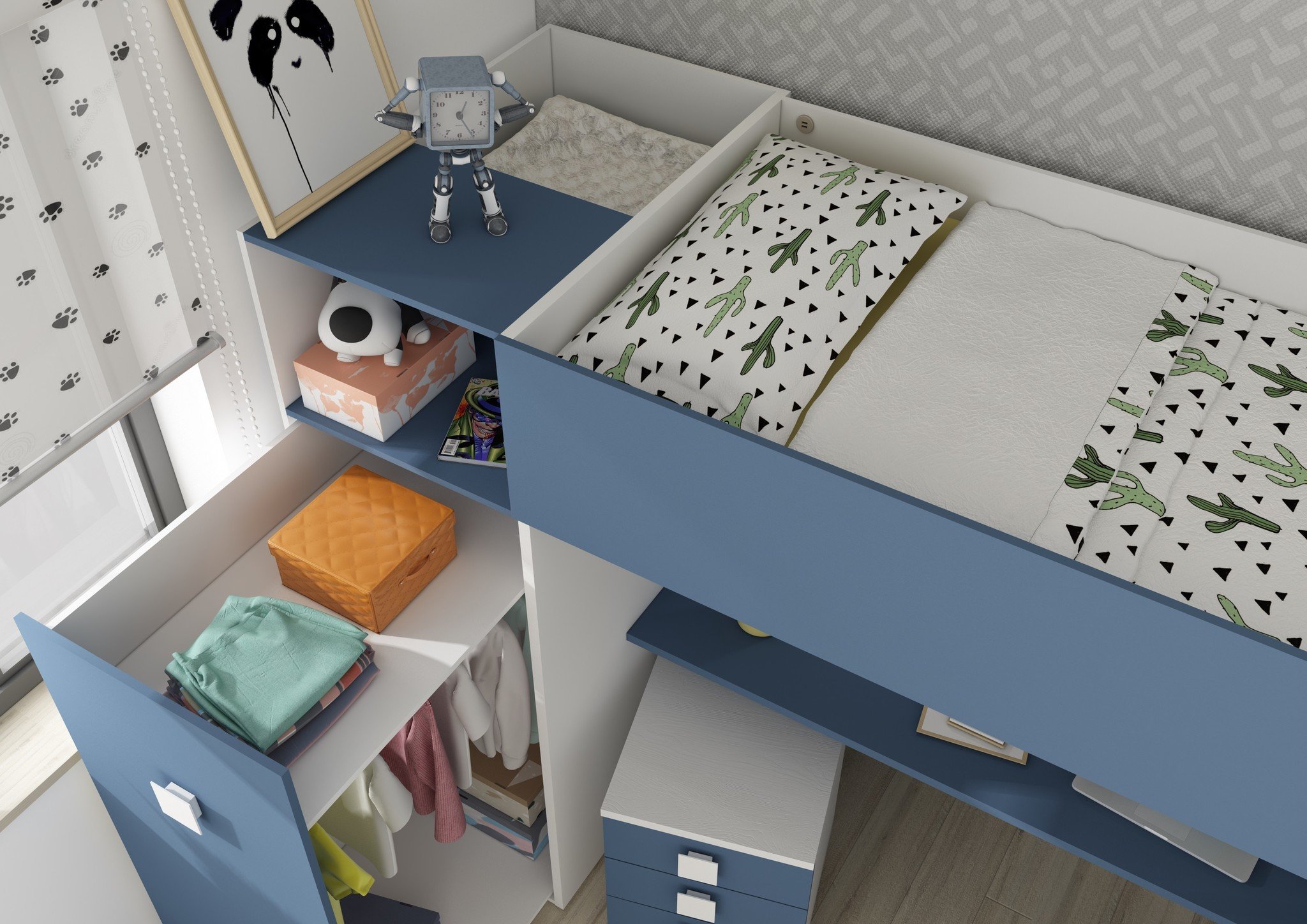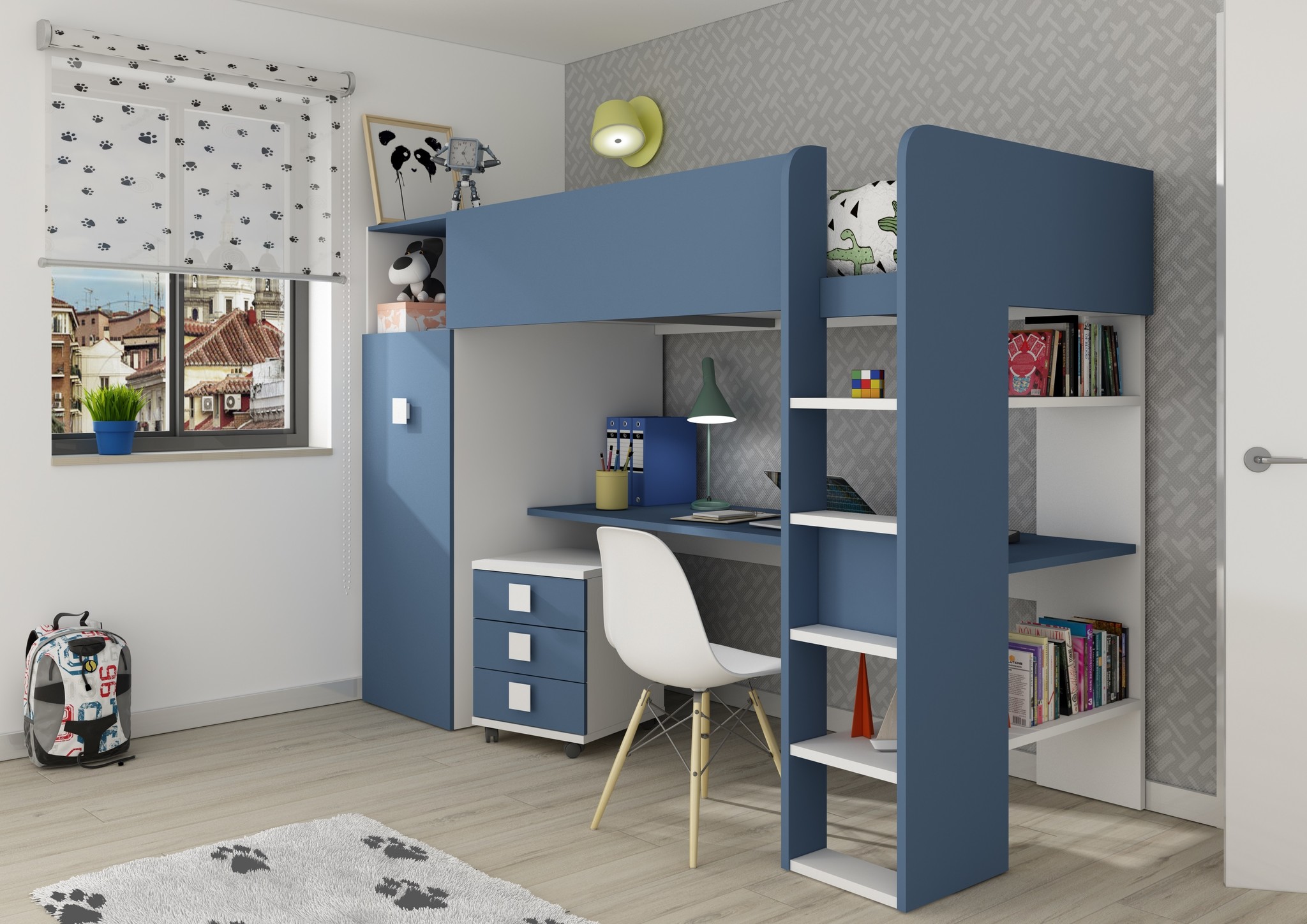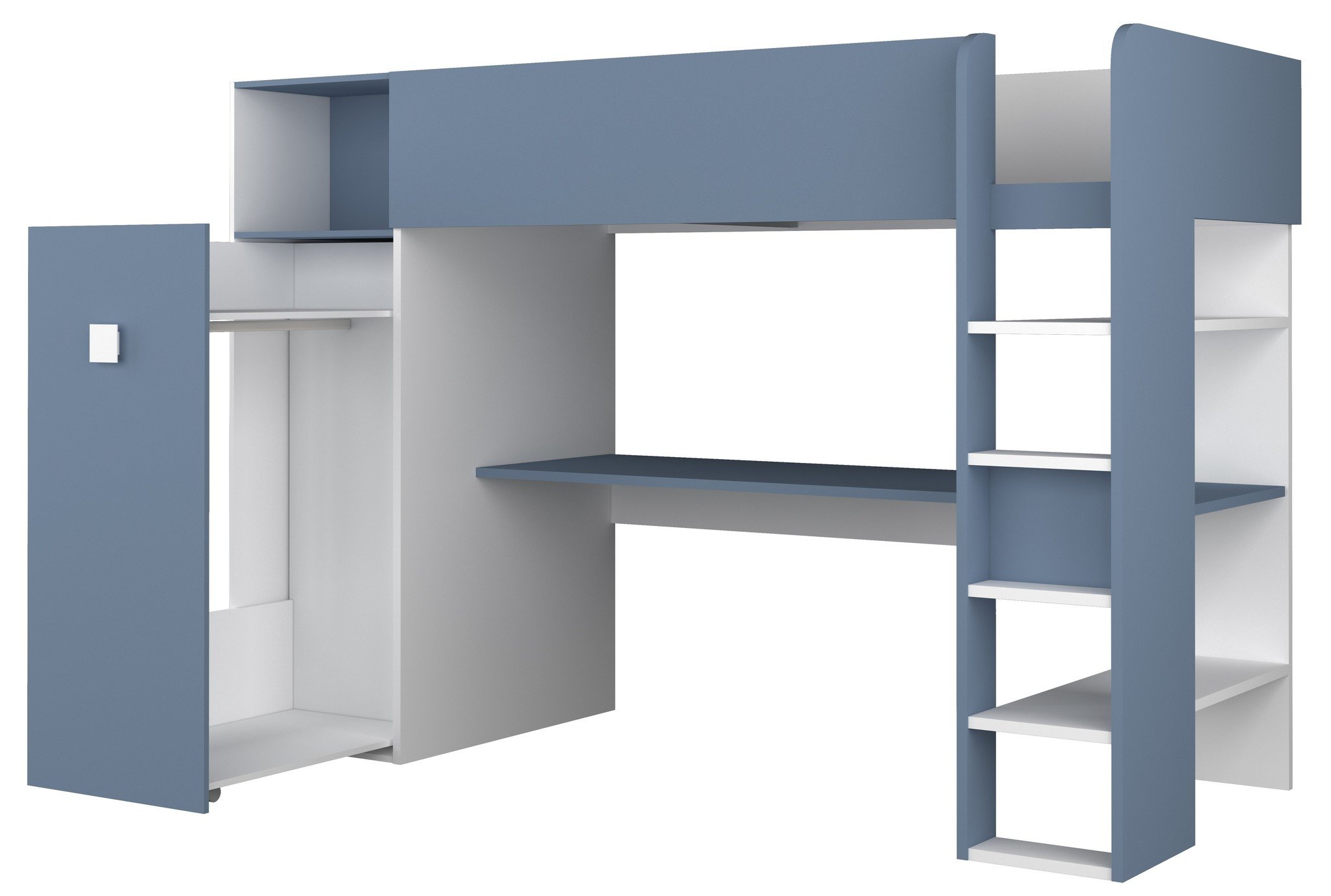 Compacte hoogslaper met kledingkast, bureau en opbergvakken.