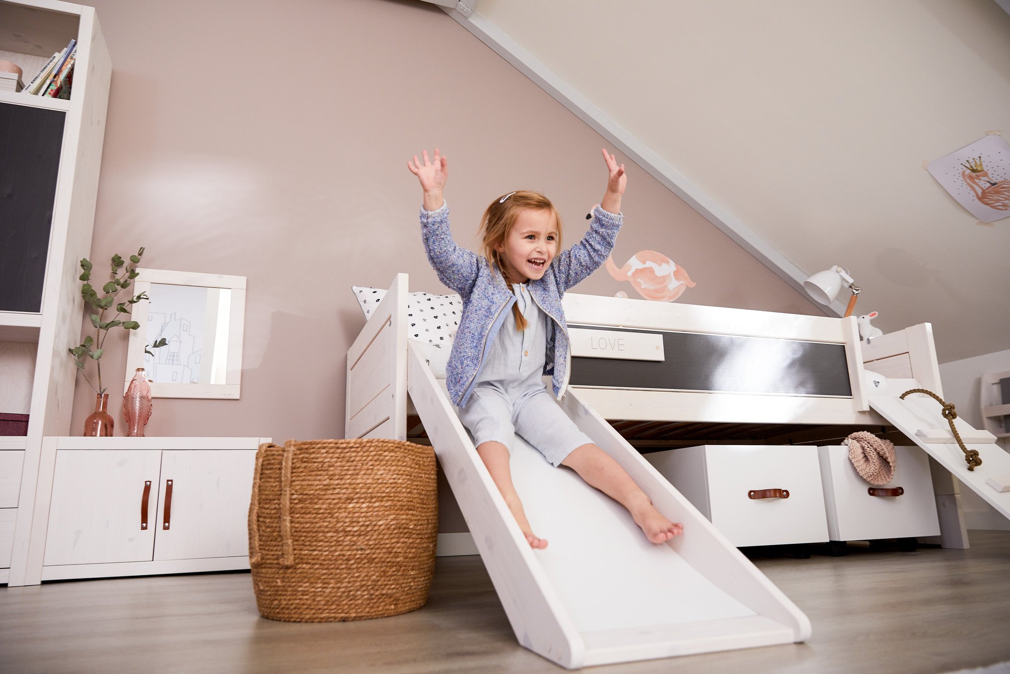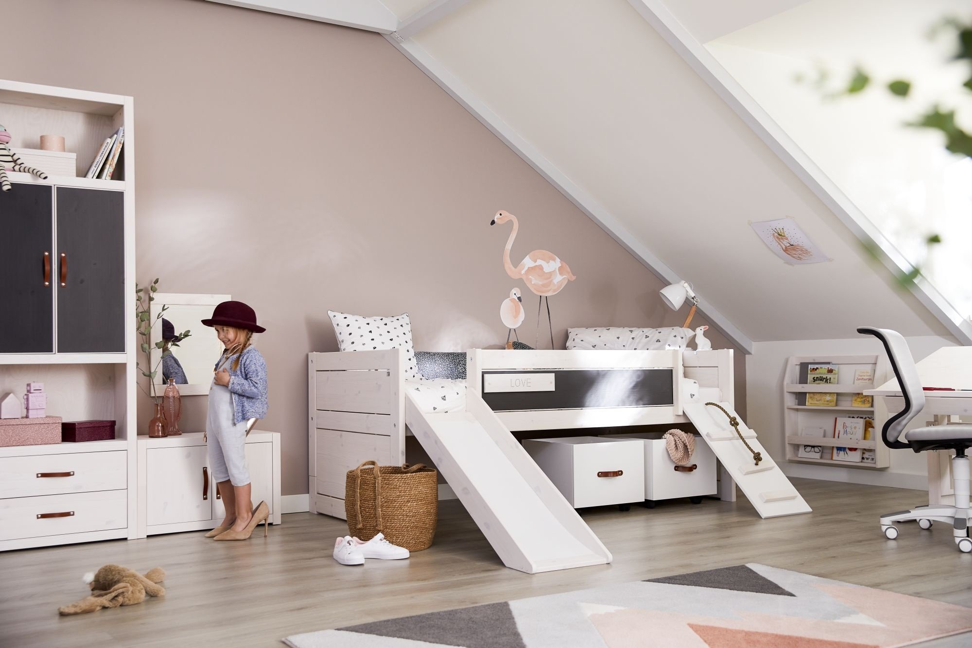 Dit avontuurlijke kajuitbed straalt spelen uit. De loopplank om het bed in te komen is voorzien van een touw om je aan op te trekken. Veel leuker dan een saai trapje voor de kleine avonturiers. Naar beneden kun je via de glijbaan of ook gewoon via de loopplank. De ruimte onder het bed is 43 cm, genoeg om spullen op te kunnen bergen. Het voorpaneel is voorzien van een krijtbord. Leuke tekeningen maken op je bed is hierdoor geen probleem.