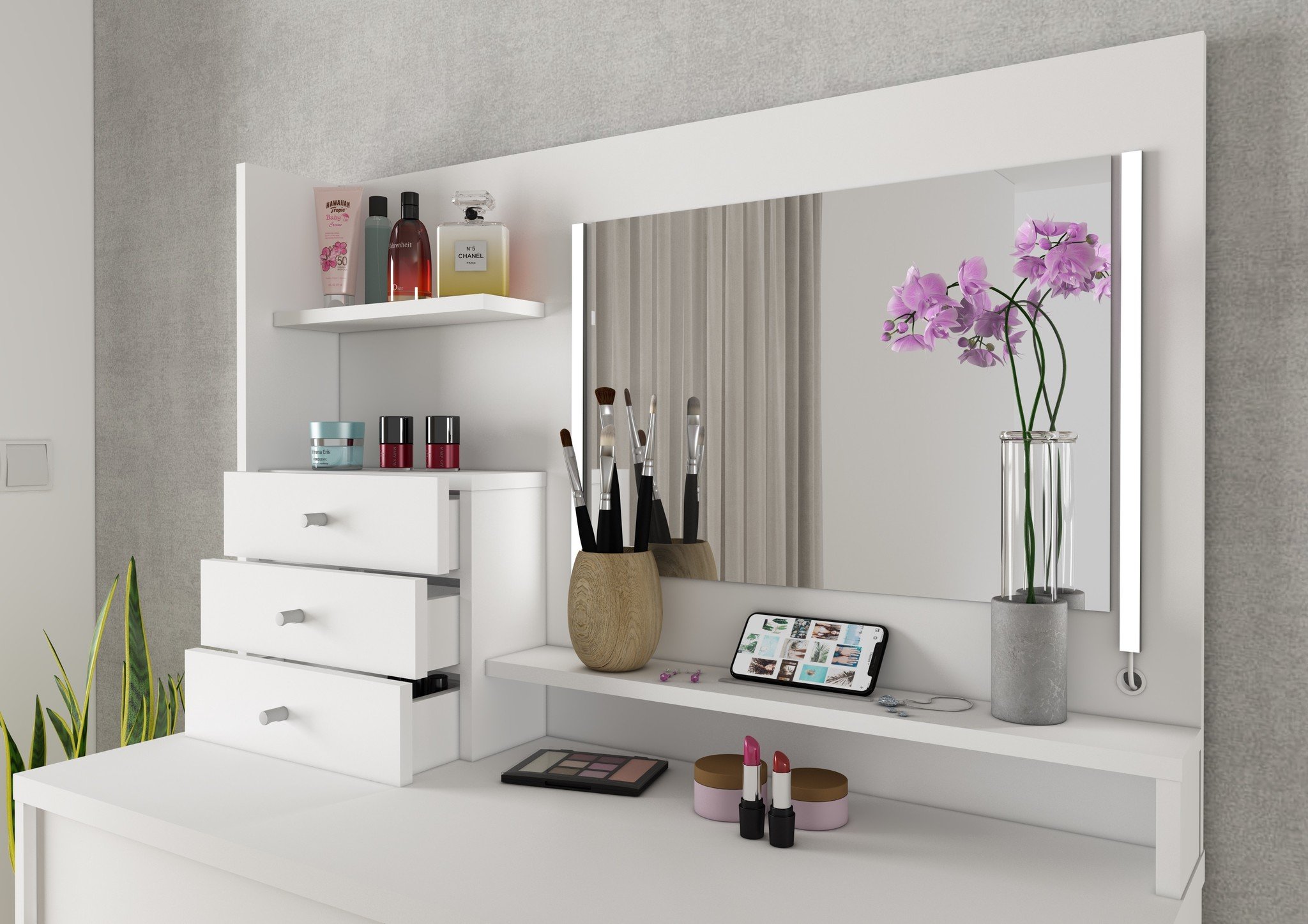 Een fijne en ruime kaptafel met LED verlichting, spiegel en veel opbergruimte.