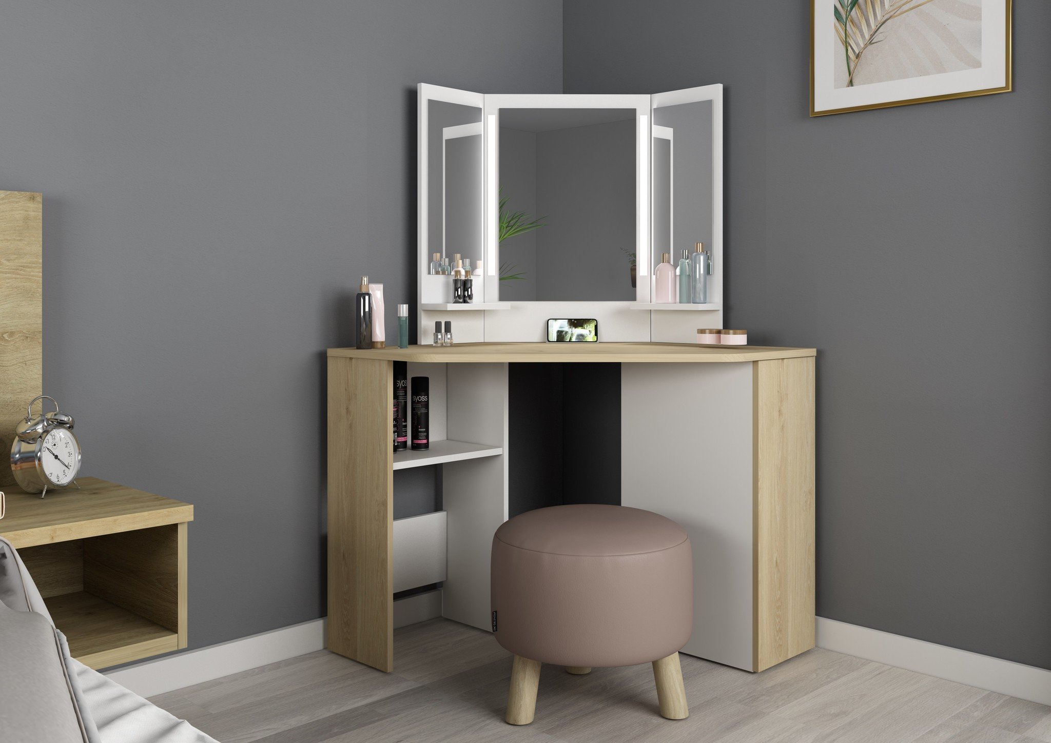 Een fijne en ruime kaptafel met LED verlichting, spiegel en veel opbergruimte.
