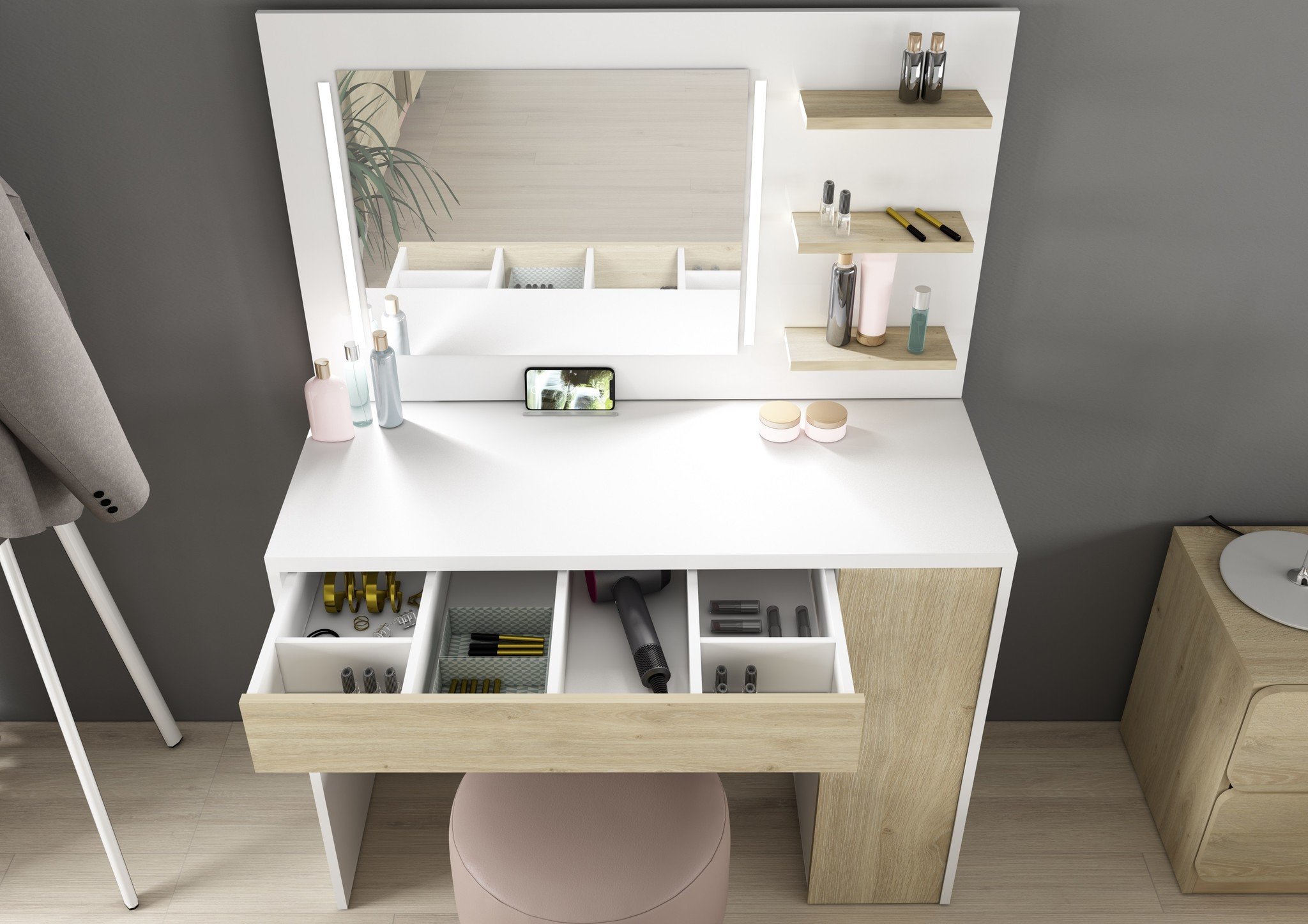 Een fijne en ruime kaptafel met LED verlichting, spiegel en veel opbergruimte.