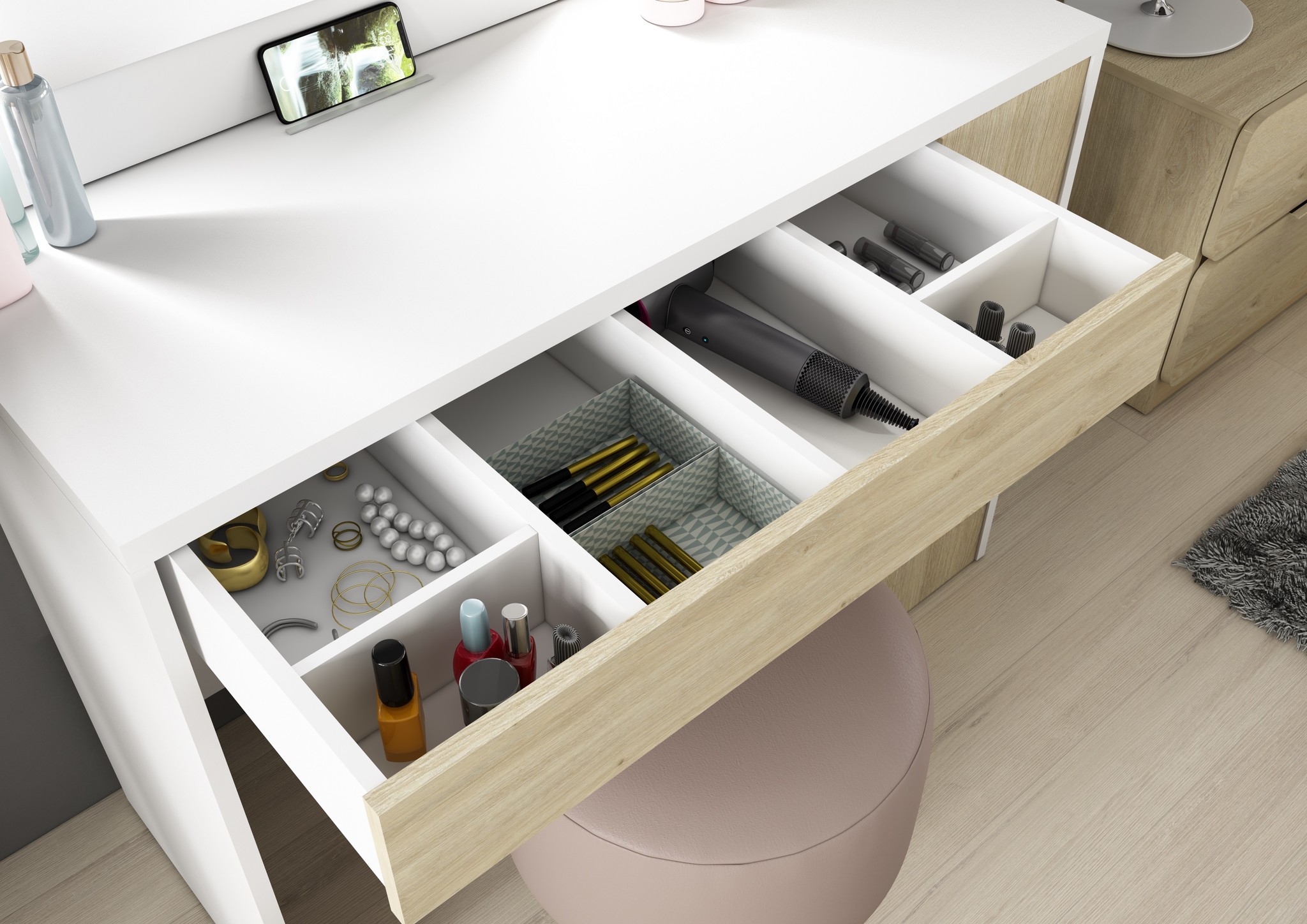 Kaptafel Vanity Glamour - Make-up tafel - Eiken/wit