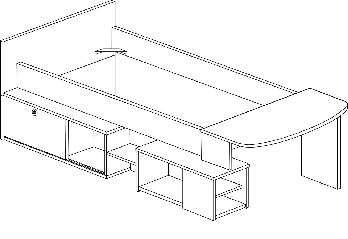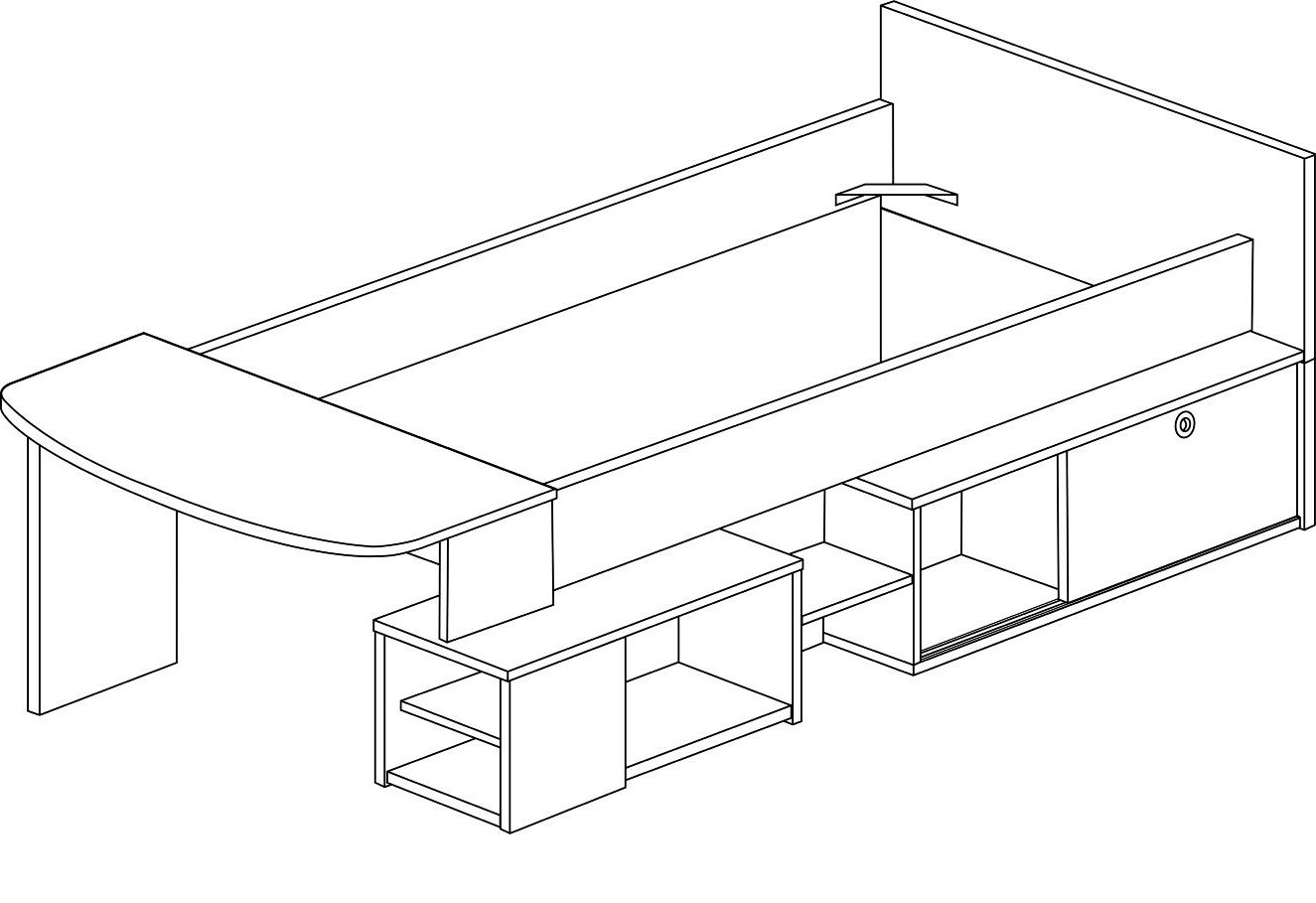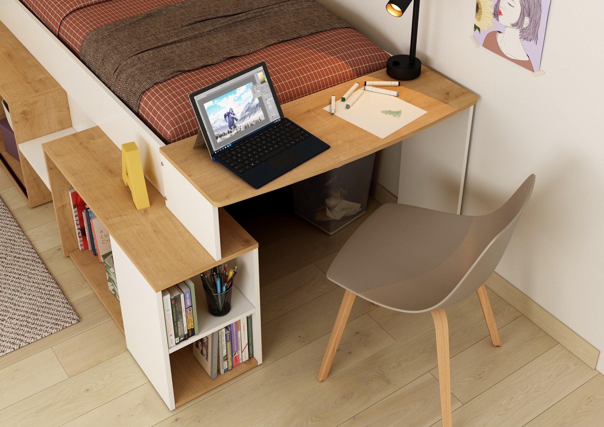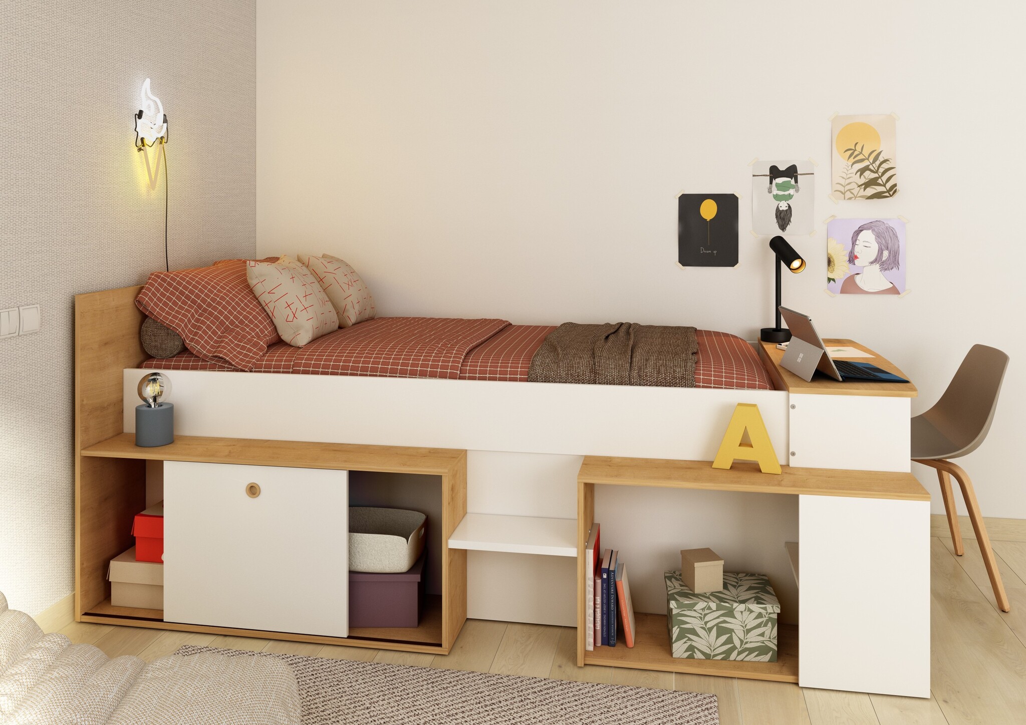 Gaby is een compact kinderbed met bureau en opbergkasten. Het kan op 2 manieren opgebouwd worden.