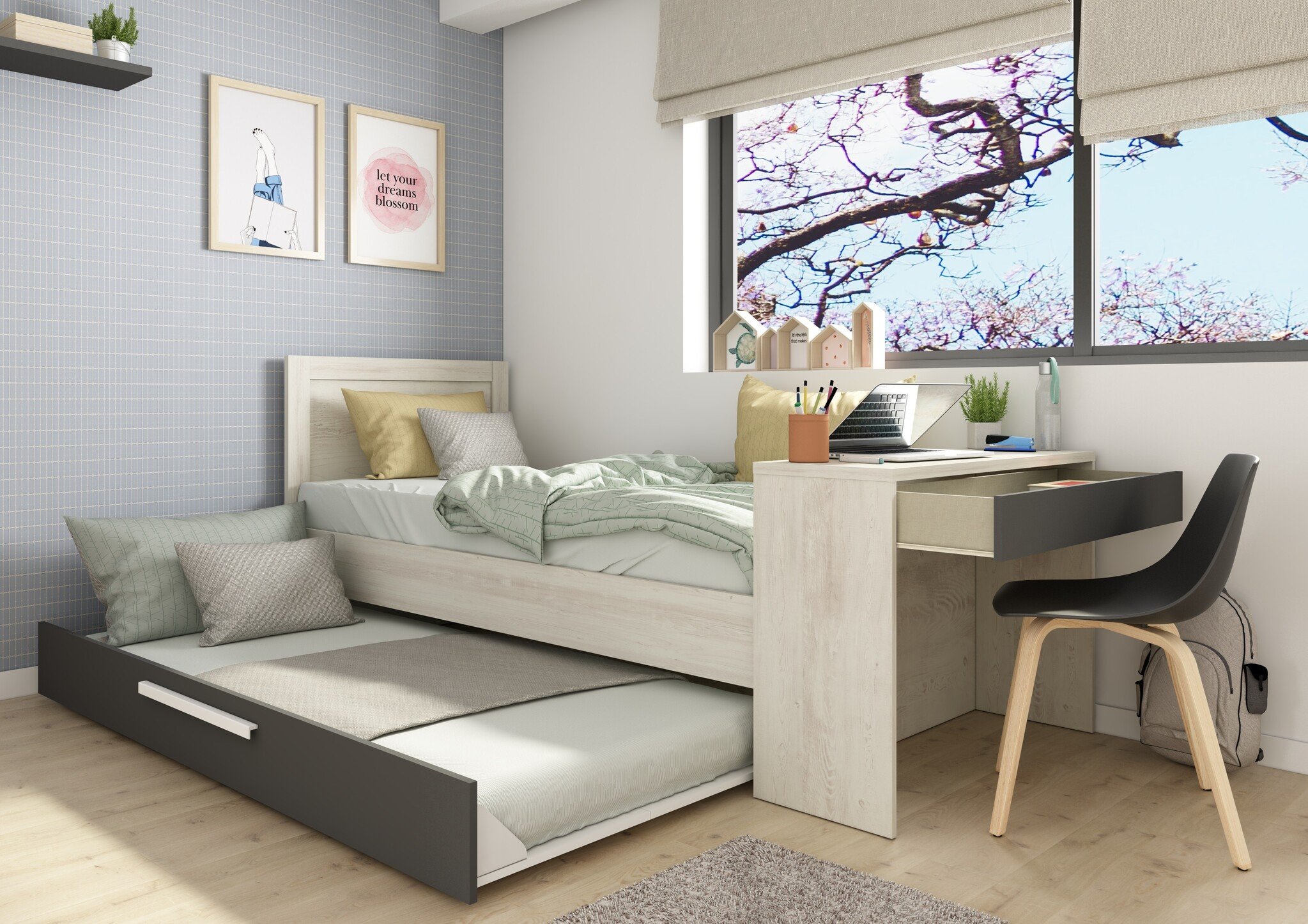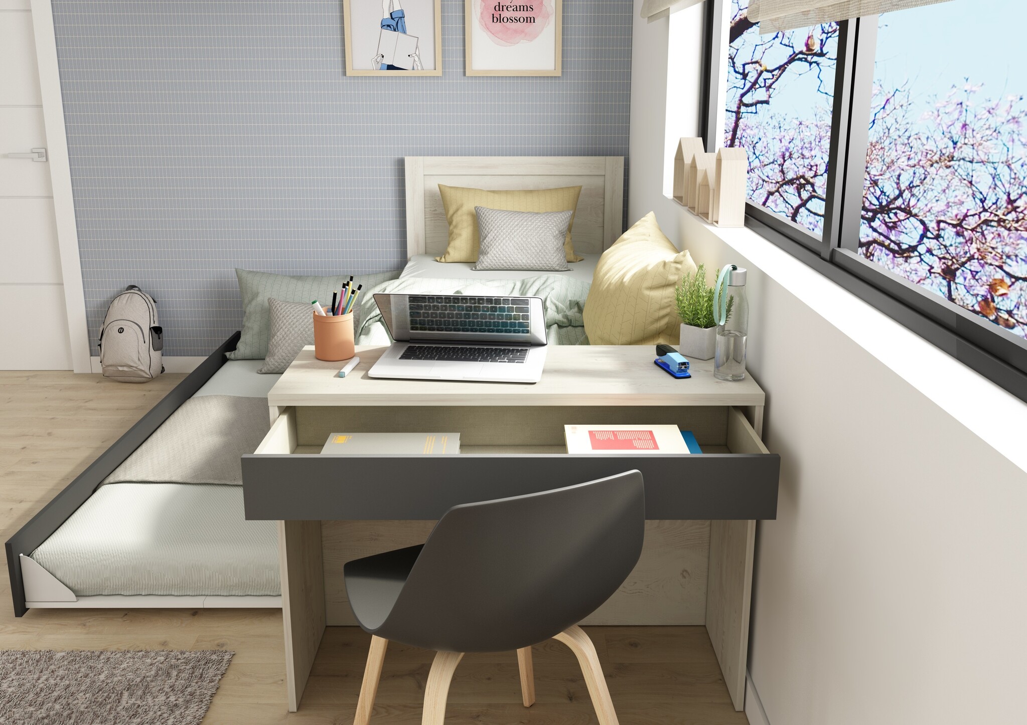 Compact kinderbed met bureau en slaaplade. In de slaaplade kan ook een matras van 90x200 gelegd worden zodat je een perfect logeerbed hebt.