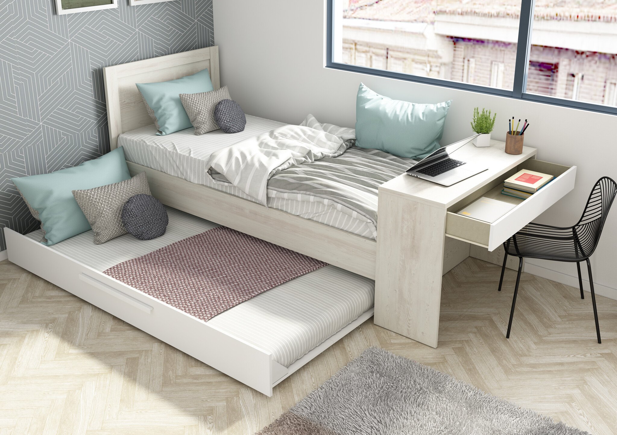 Compact kinderbed met bureau en slaaplade. In de slaaplade kan ook een matras van 90x200 gelegd worden zodat je een perfect logeerbed hebt.