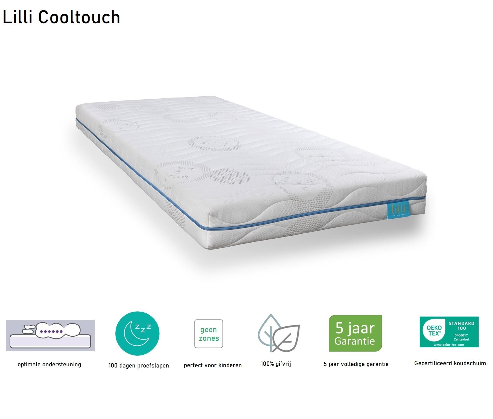 Wil je een luxere uitvoering van het kindermatras Lilli Comfort? Kies dan voor het kindermatras Lilli Cooltouch. Dit matras heeft een afritsbare Cooltouch matrashoes (tijk) die erg aangenaam aanvoelt en extra goed ventileert.