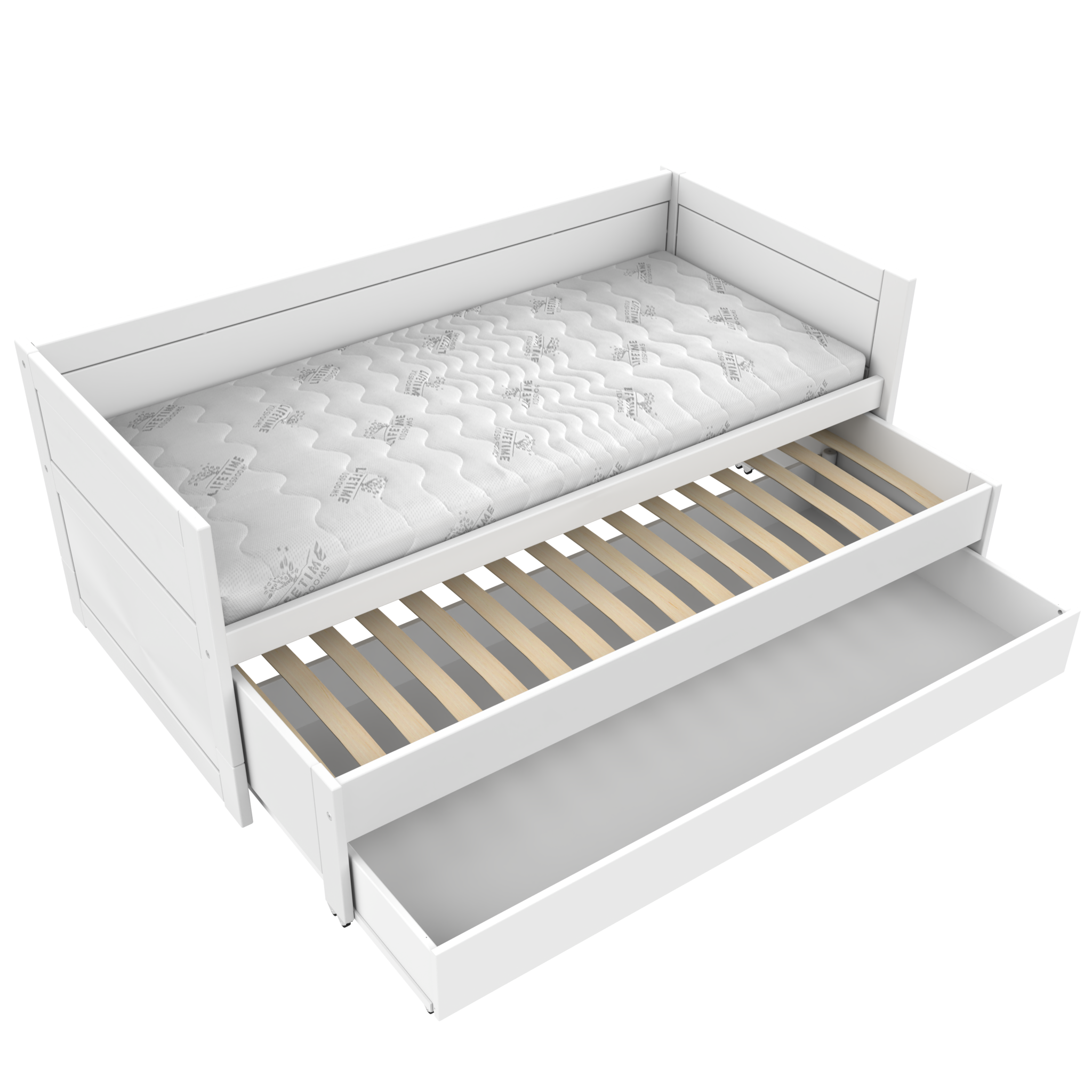 Dit kajuitbed is een heel compleet bed, bedoeld voor regelmatige logeerpartijtjes. Onder het logeerbed zit nog een ruime opberglade. De meeste ontwerpen hebben 1 lade waardoor je moet kiezen voor logeerbed of opberglade, hierbij hoef je die keuze niet te maken. Als je wil kun je zelfs nog van de onderste lade een logeerbed maken zodat je 2 logeerplekken maakt. De onderste lade is dus te gebruiken als opberglade, wil je hier nog ook een matras inleggen voor extra logees? Je moet dan wel nog een speciale bodem erbij kopen van 53 euro.