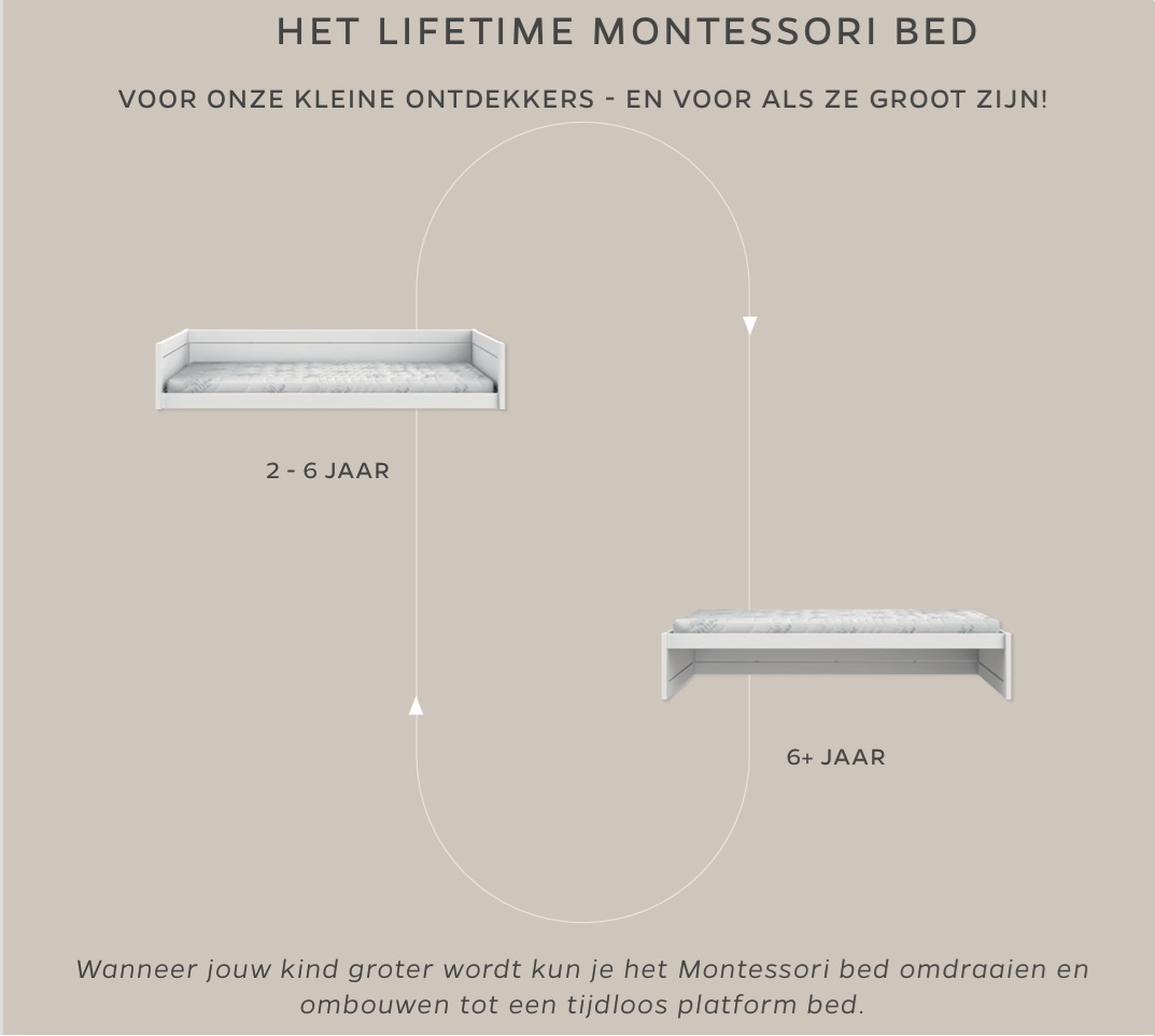 Als je kleine ontdekkingsreiziger groter wordt, kan het LIFETIME Montessoribed weer in elkaar worden gezet tot een stevig platformbed met een tijdloos design. Het LIFETIME-platformbed is geschikt voor kinderen, tieners en zelfs volwassenen.