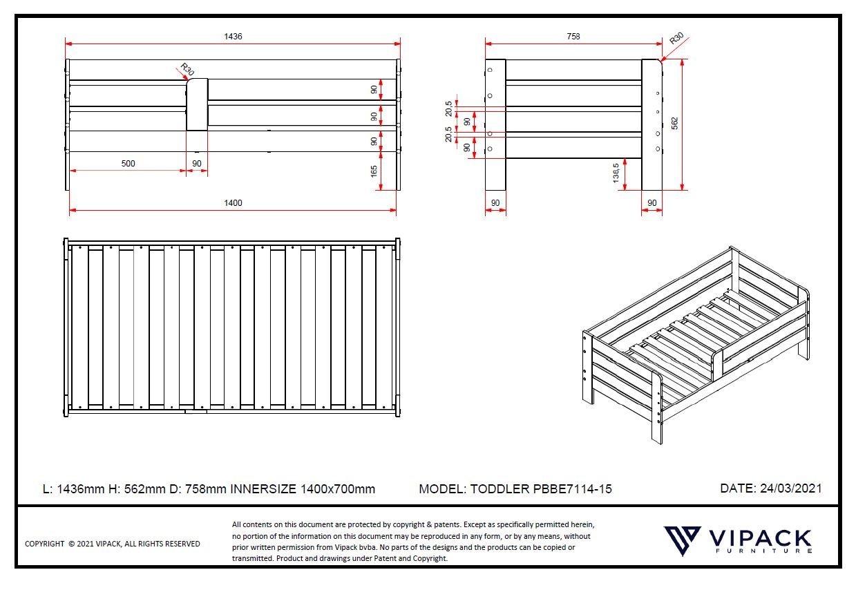 Dit Peuterbed Toddler 71 in het Grijs is een ideale stap van een babybed naar een groter bed. Je kleine zal zelfstandig uit bed kunnen kruipen en s'nachts veilig omringt liggen binnen de extra hoge veilige uitvalbeveiliging rondom.