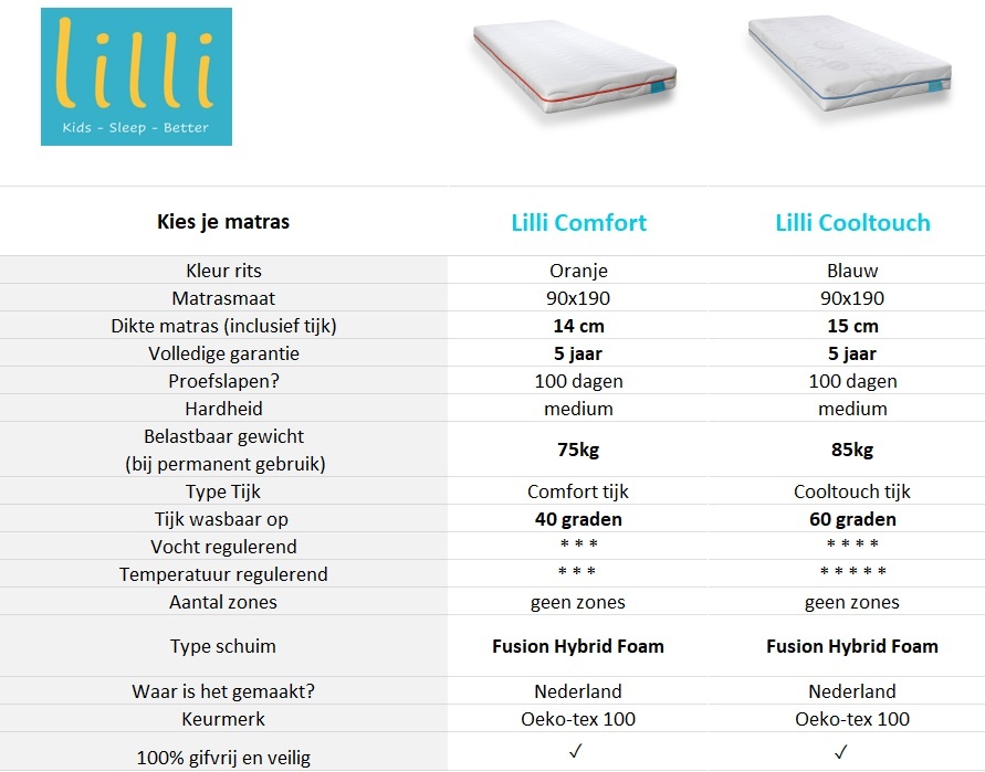 Bij de productfoto's zie je een handig overzicht van de kenmerken van de verschillende matrassen. Je kunt natuurlijk ook even naar de productpagina van het matras gaan voor uitgebreide informatie.