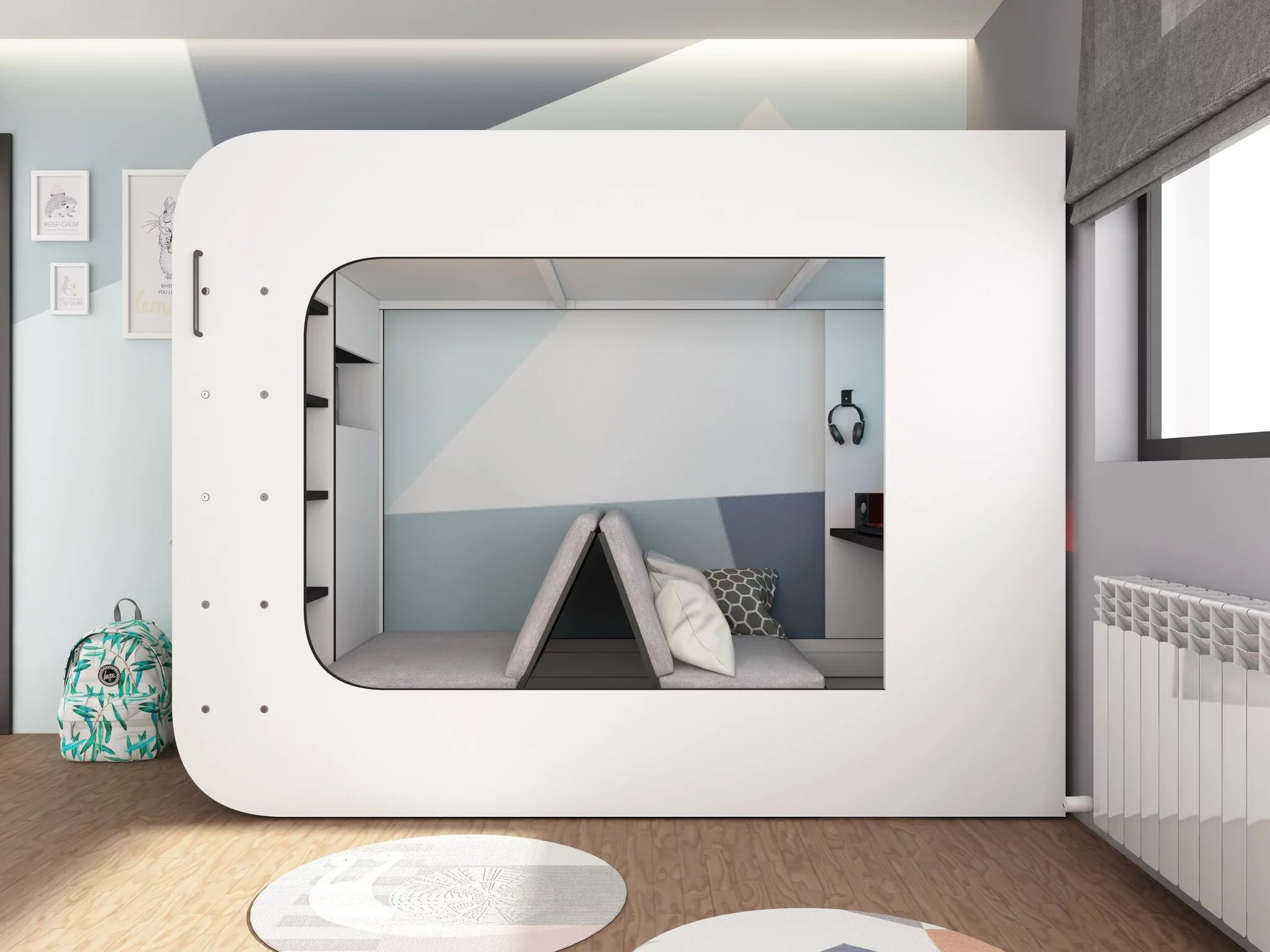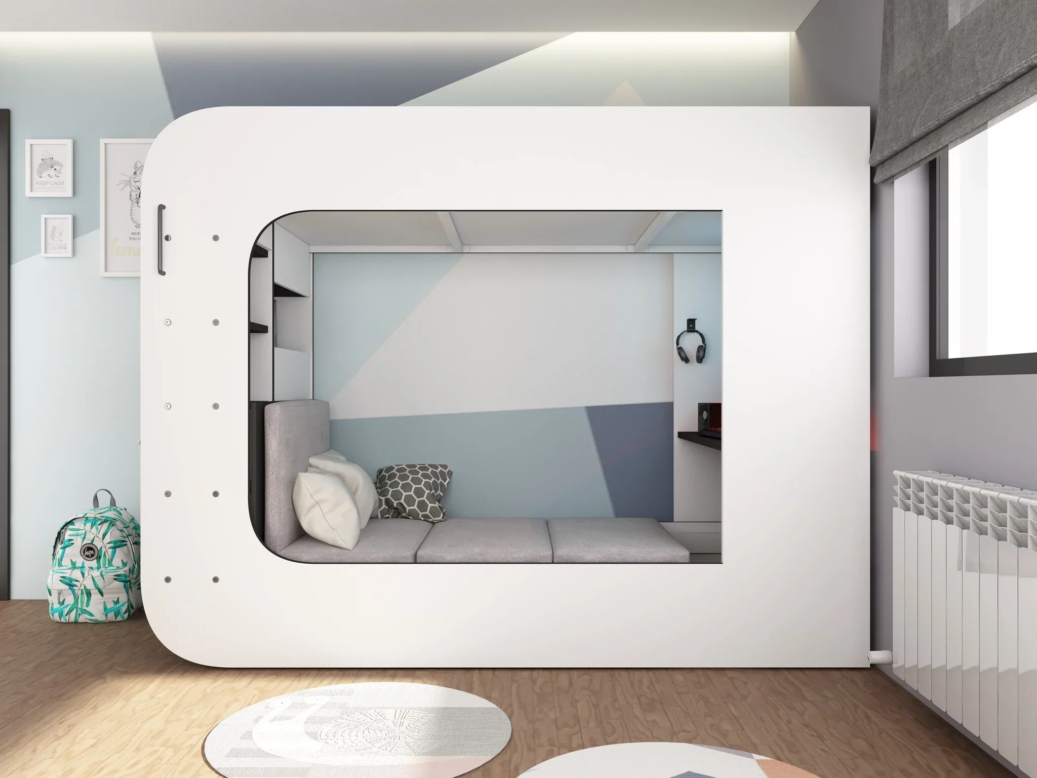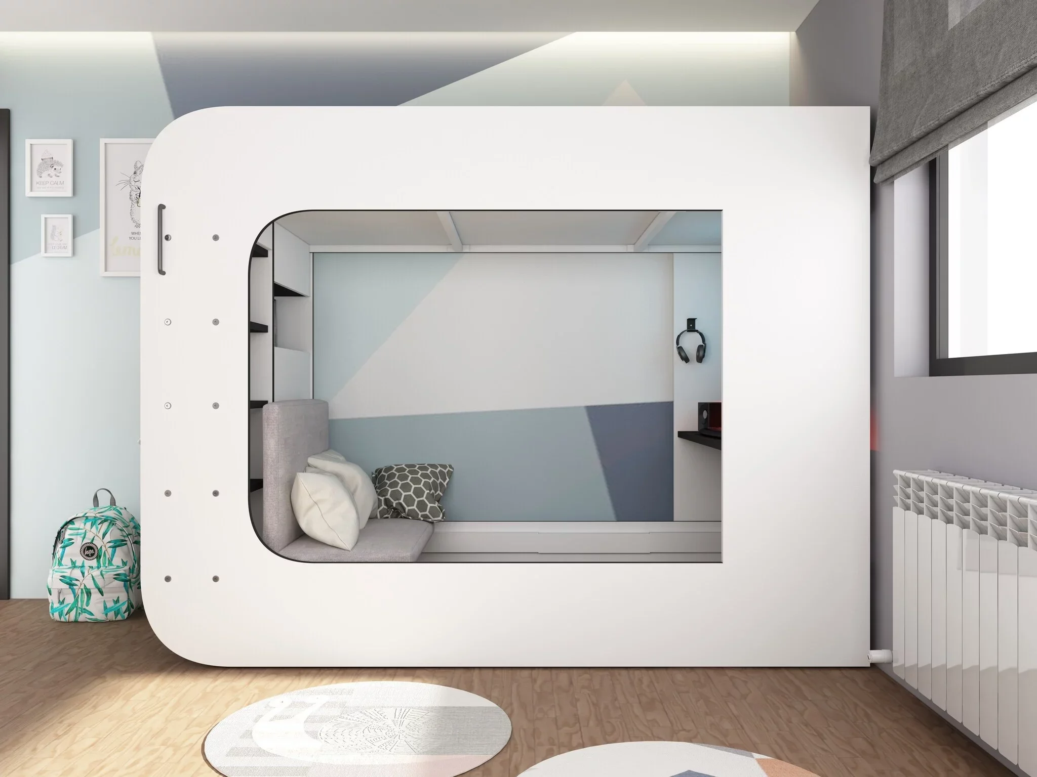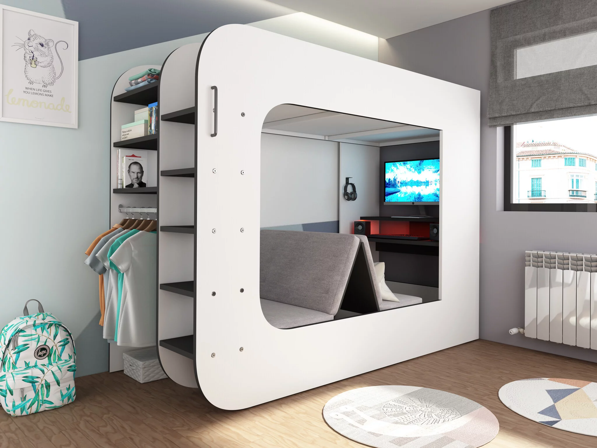 De hoogslaper wordt in Barcelona gemaakt en biedt naast een slaapplek en gamebureau ook een zee aan opbergruimte.