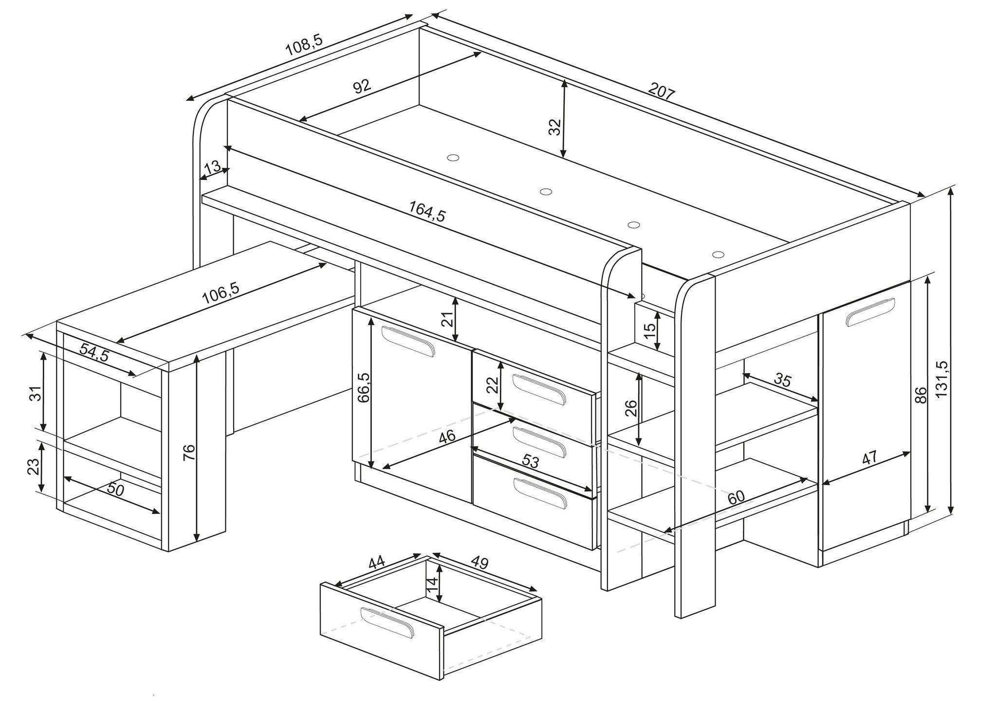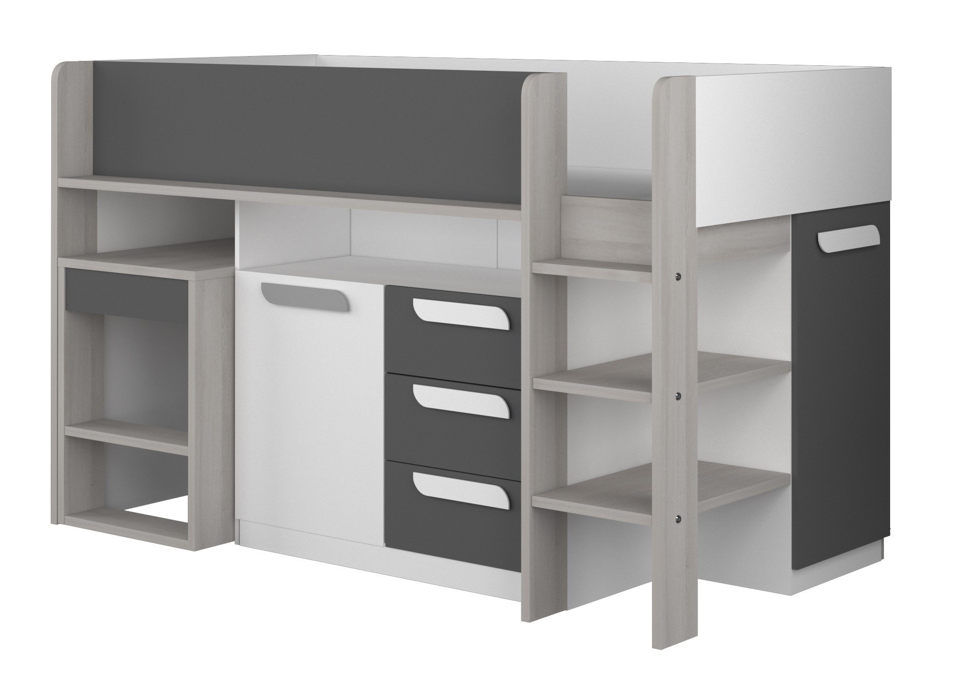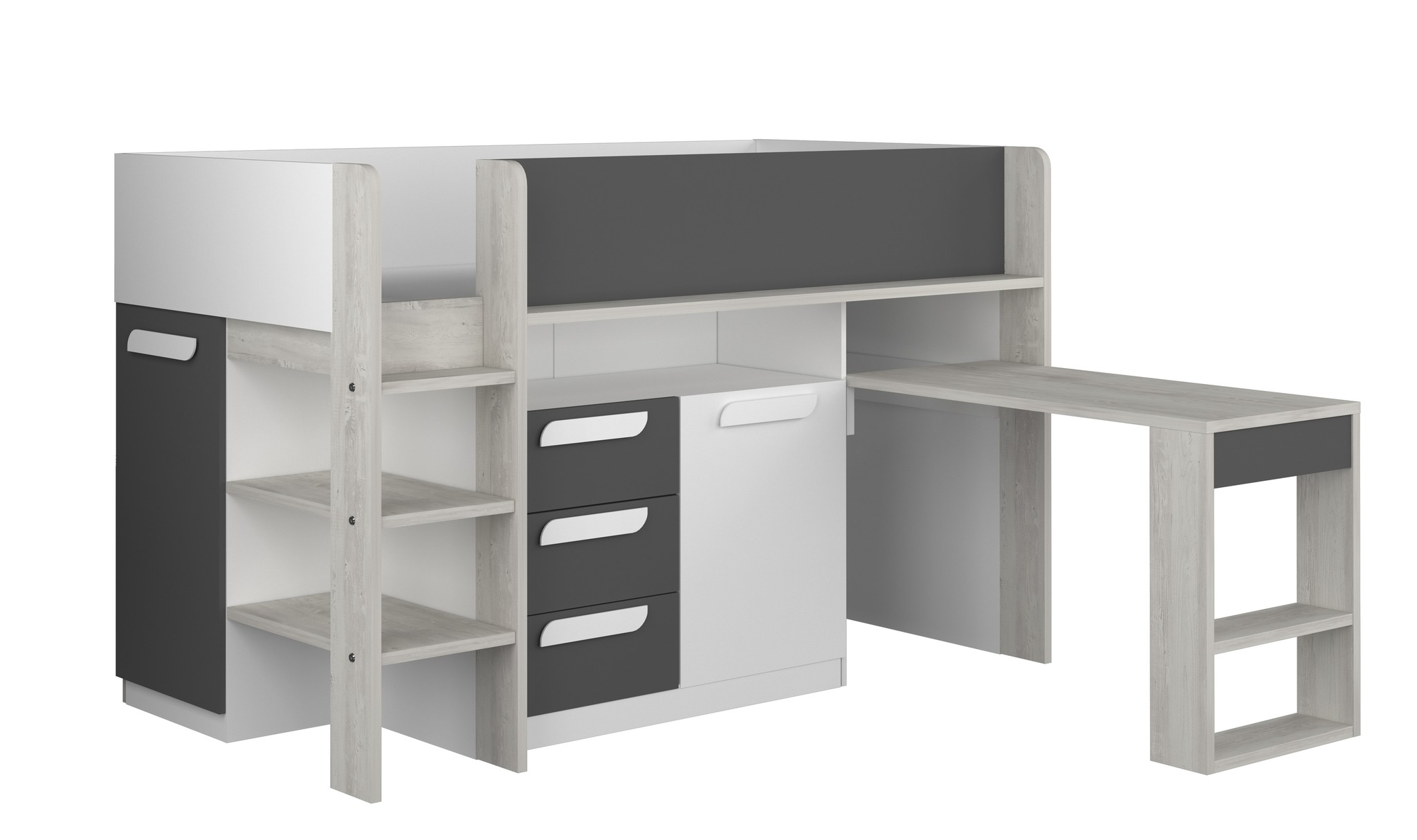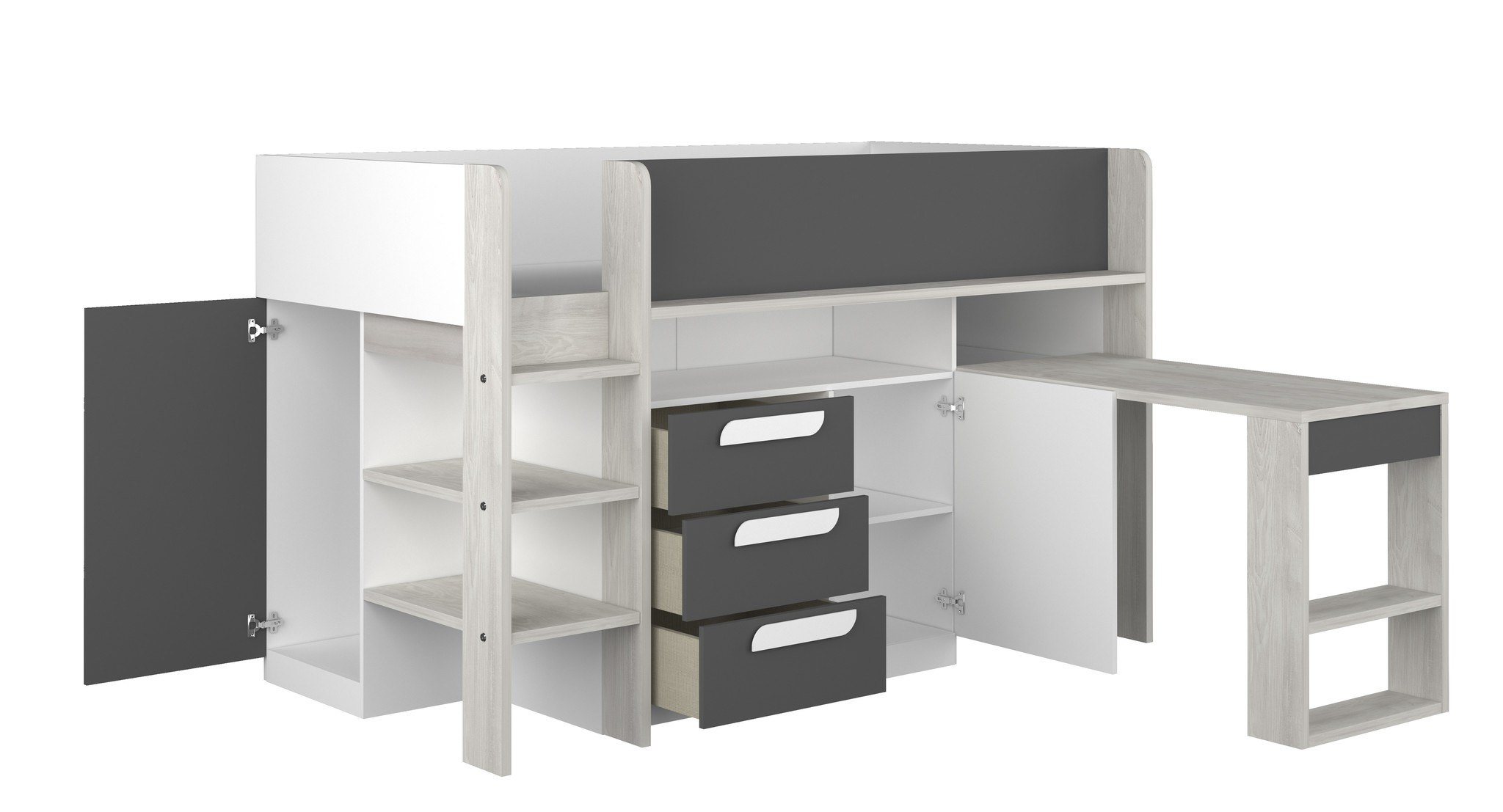 Slim bedachte halfhoogslaper met uitschuifbaar bureau en heel veel opbergruimte.