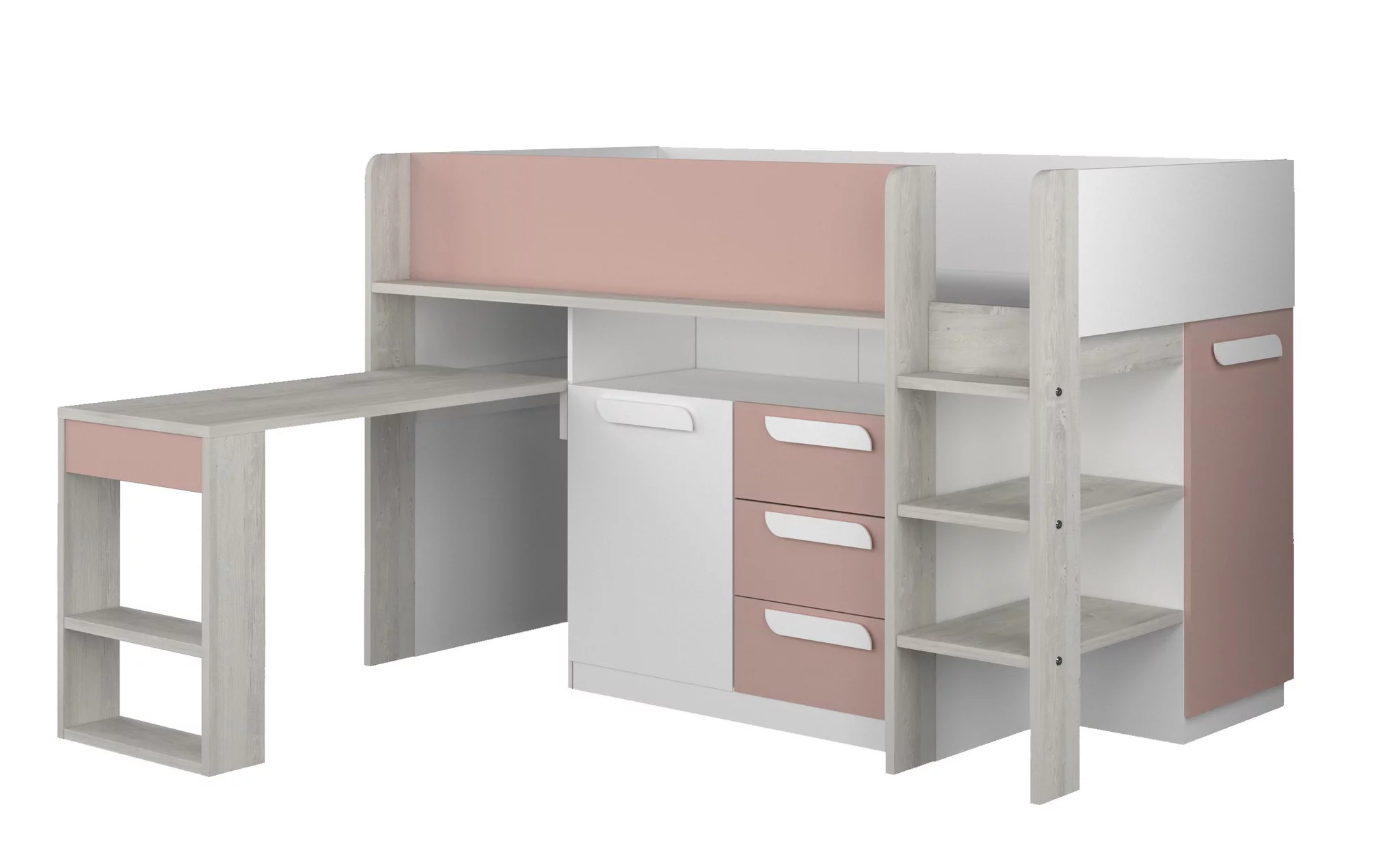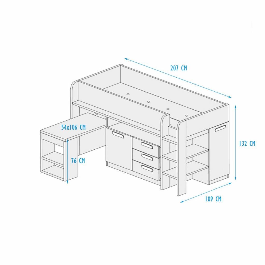 Slim bedachte halfhoogslaper met uitschuifbaar bureau en heel veel opbergruimte.